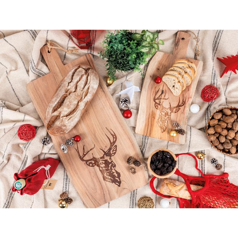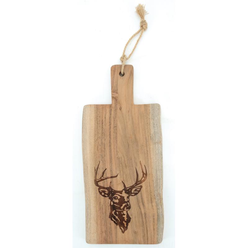 Natural acacia wood cutting board with cicada laser printed design.