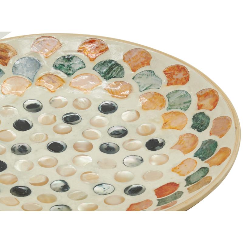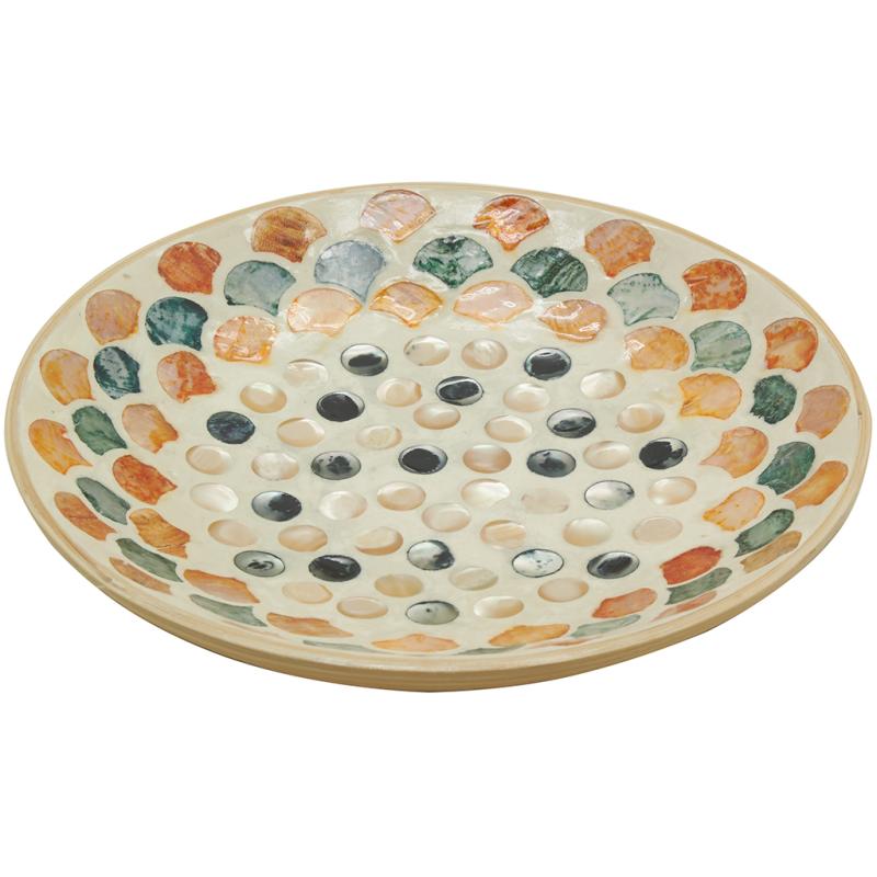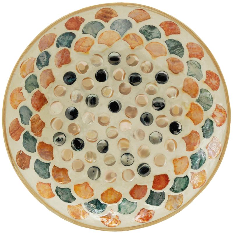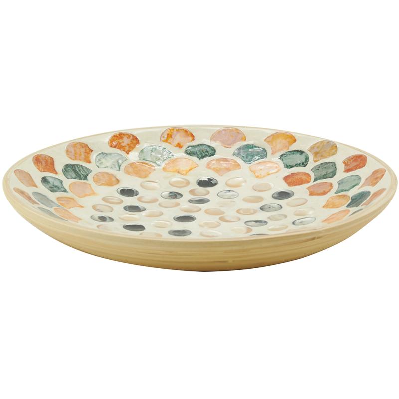 Round bamboo catchall tray with colorful mother-of-pearl inlay
