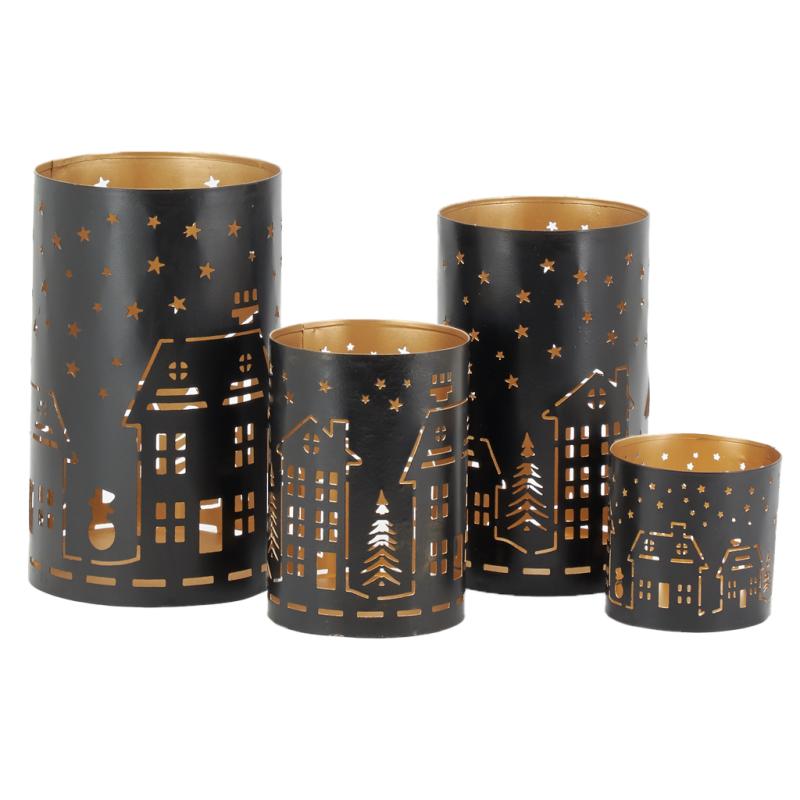 Set of 4 candle holders in black tinted metal. Cut-outs in houses shape
