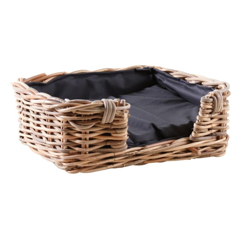 Rectangular dog basket in gray wicker with removable cushion filled with polyether wadding (100% cotton fabric).