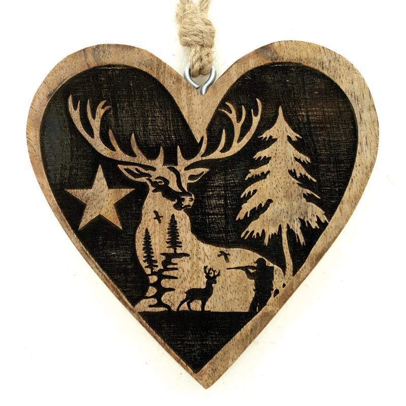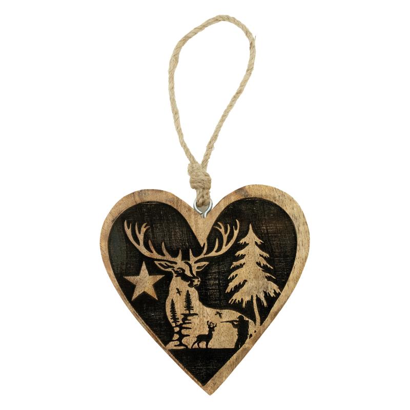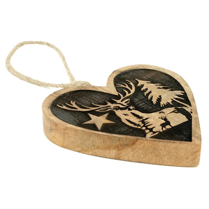 Hanging mango wood heart with laser-cut deer decoration. Rope handle.
