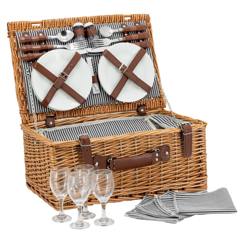 Fitted for 4 place settings: White plates + cutlery + cups + salt shaker + pepper shaker