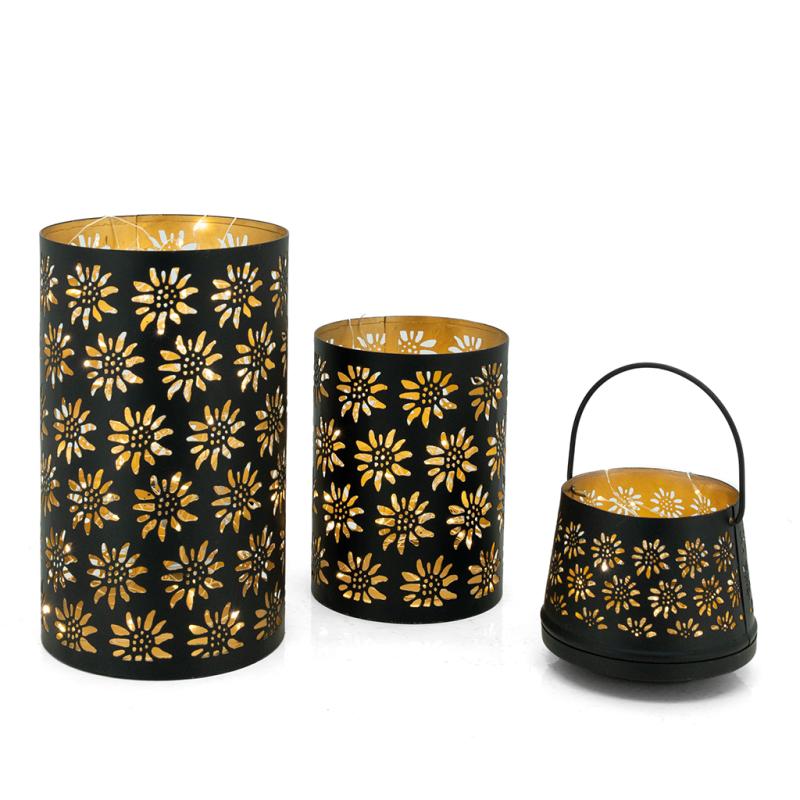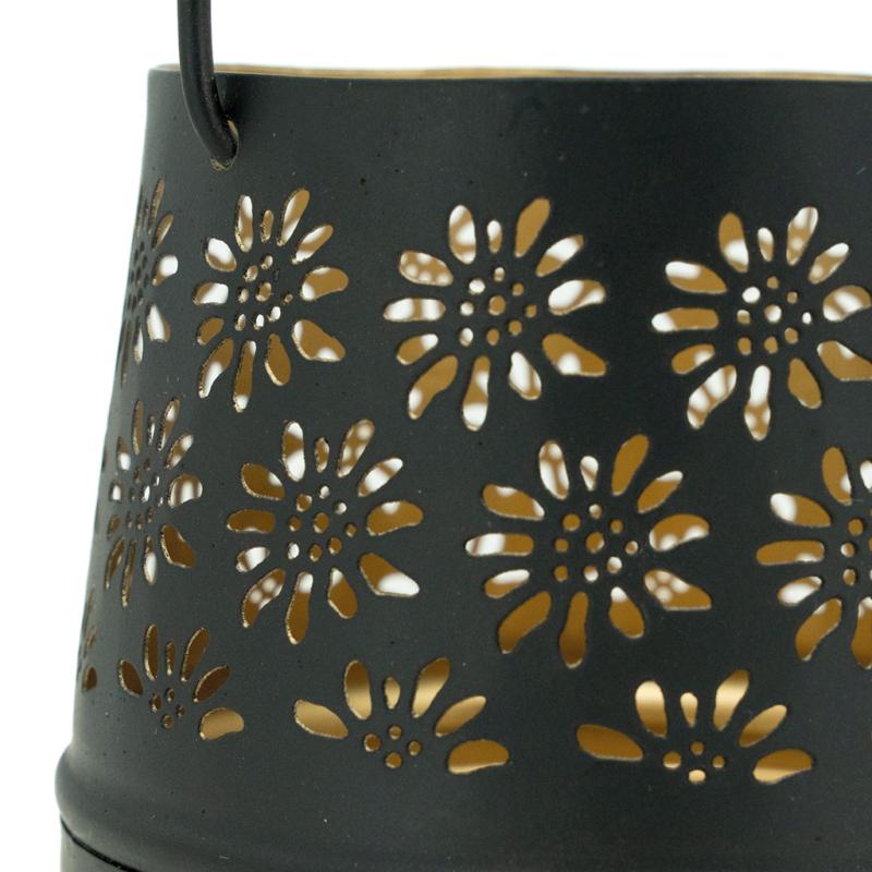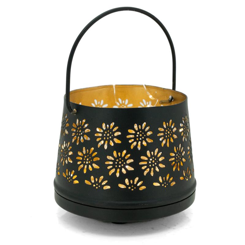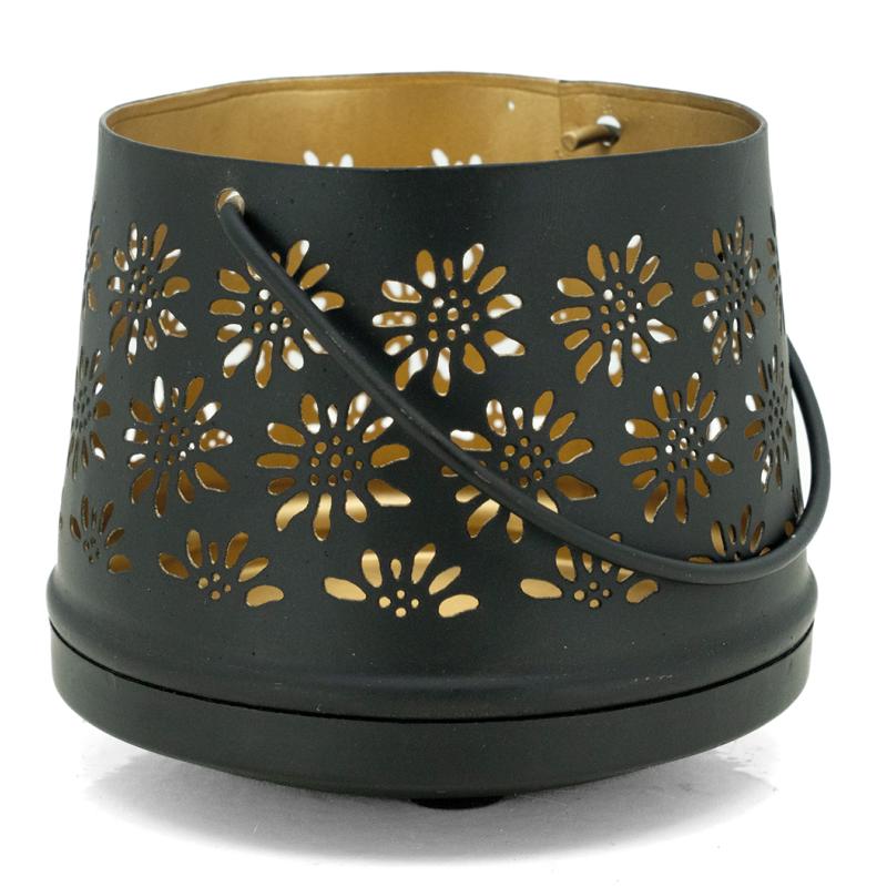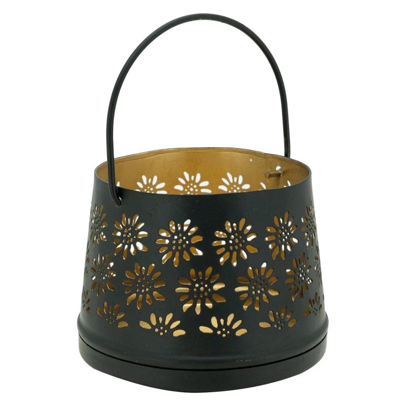 Lacquered metal candle holder, edelweiss cut-out. Gold interior. With movable handle.