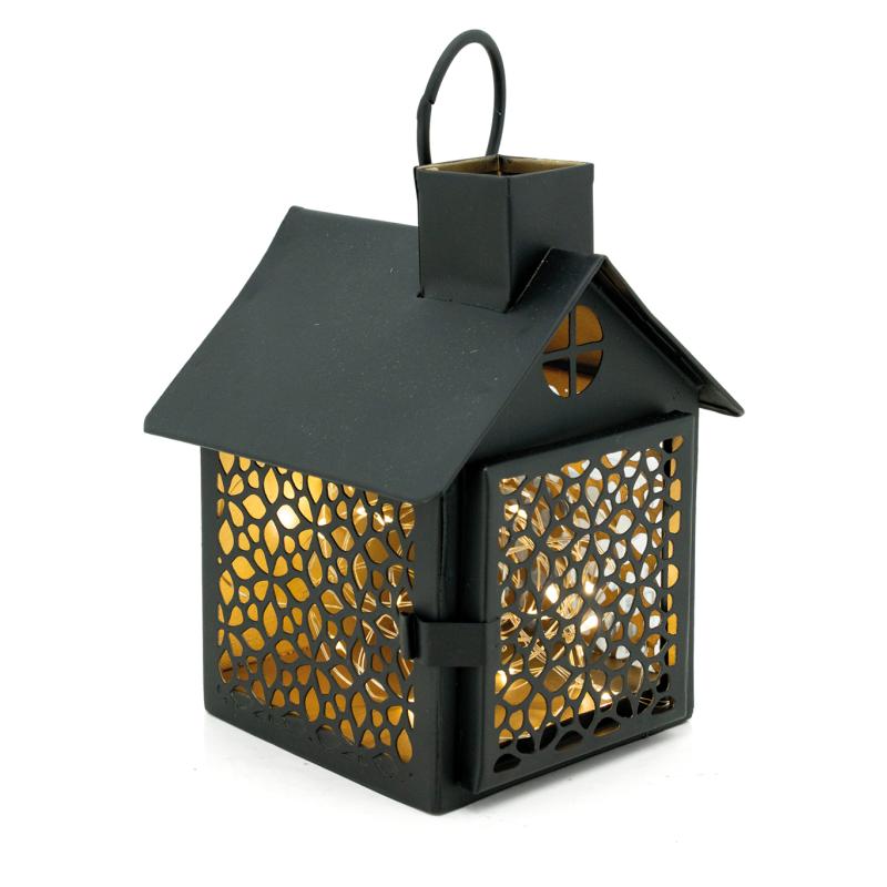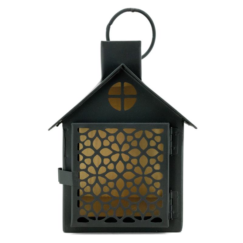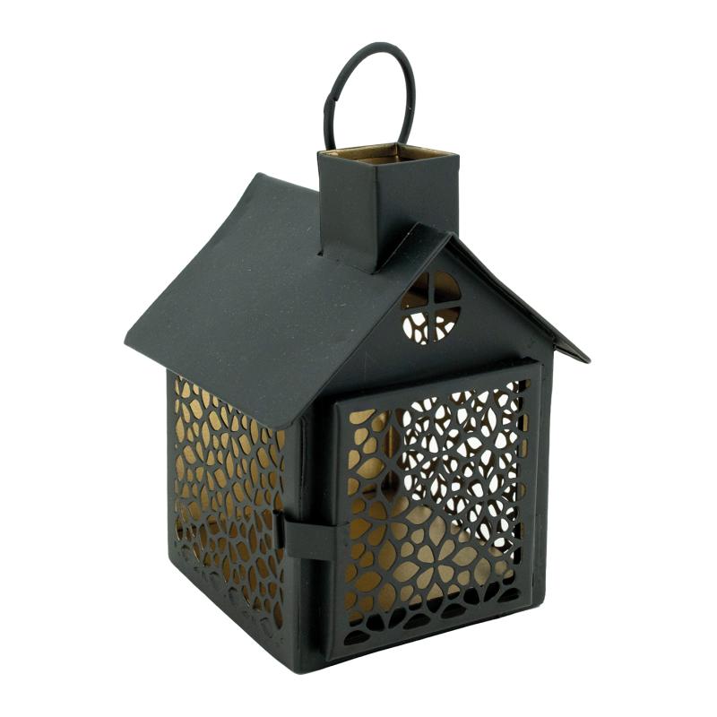 Black lacquered metal candle holder. Gold interior. With movable handle.