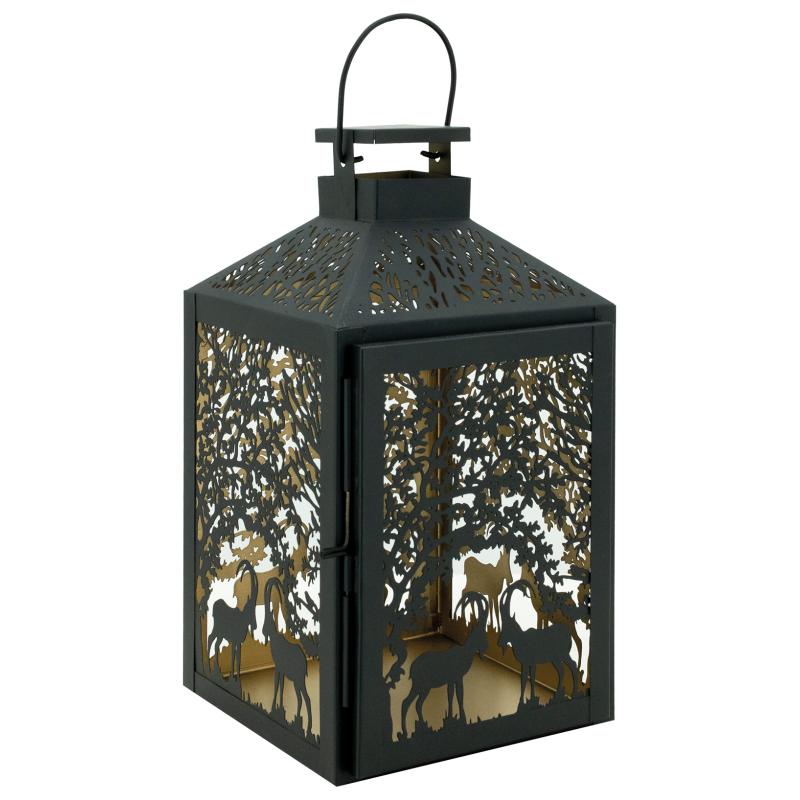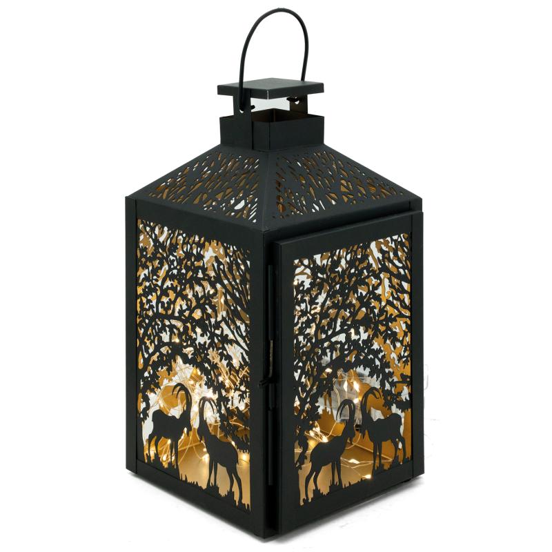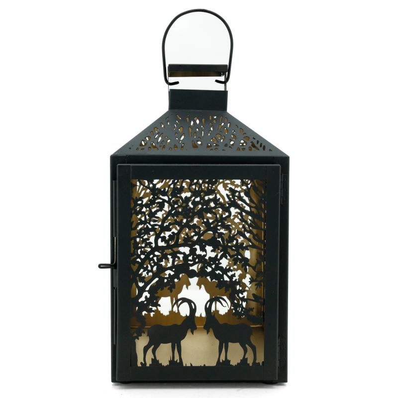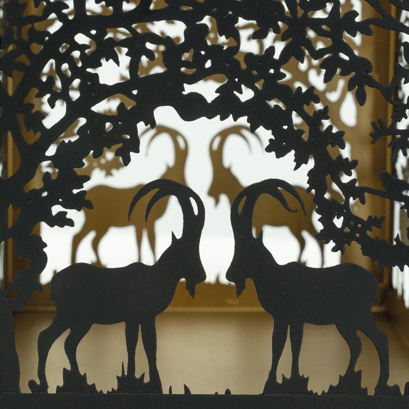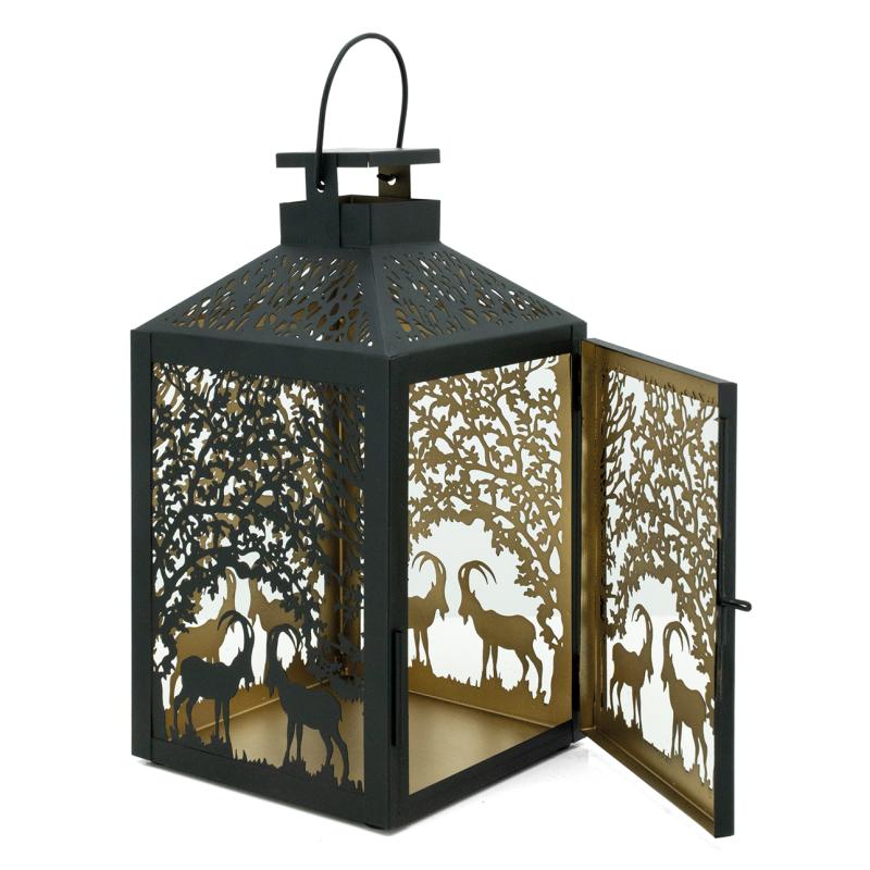 Black lacquered metal candle holder, ibex cut-out. Gold interior. With movable handle.
