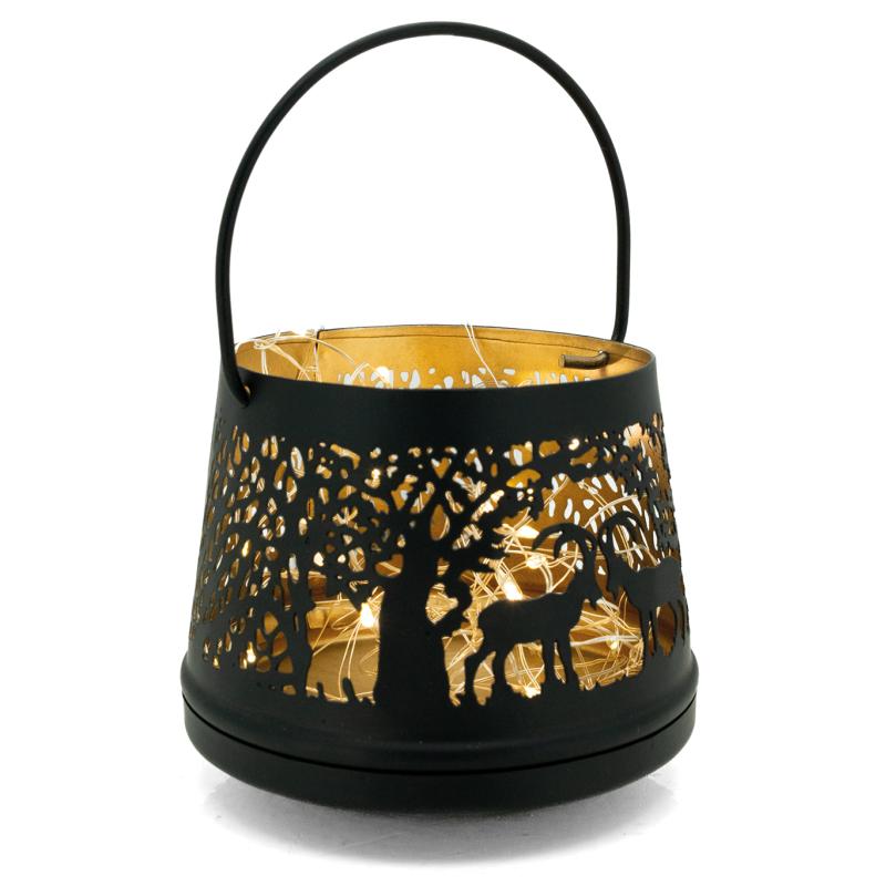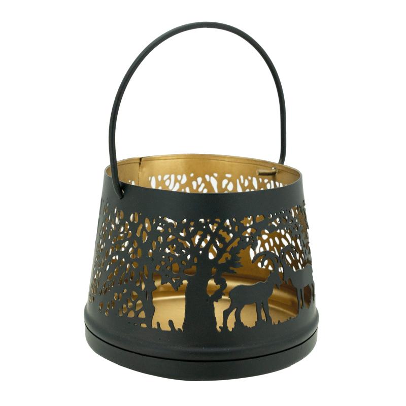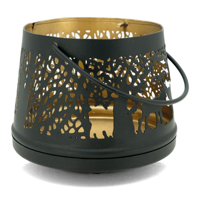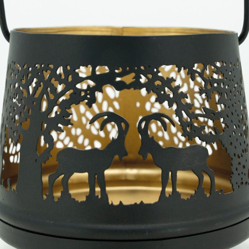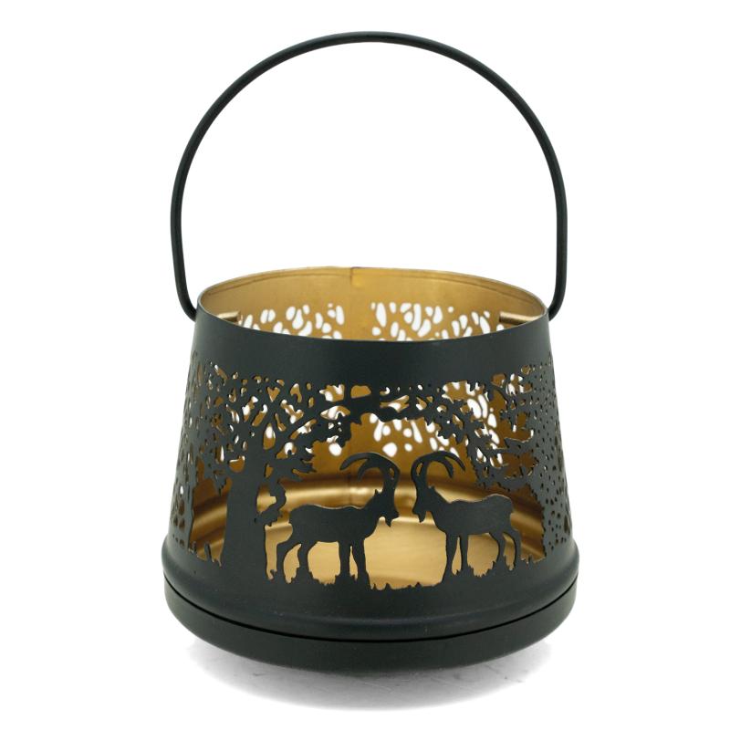 Black lacquered metal candle holder, ibex cut-out. Gold interior. With movable handle.