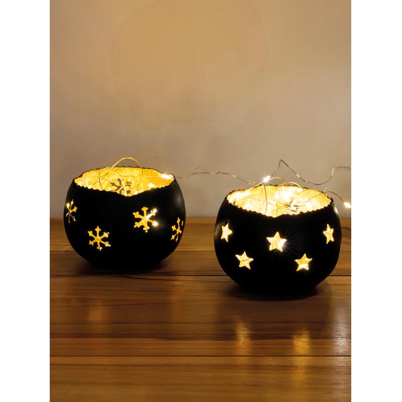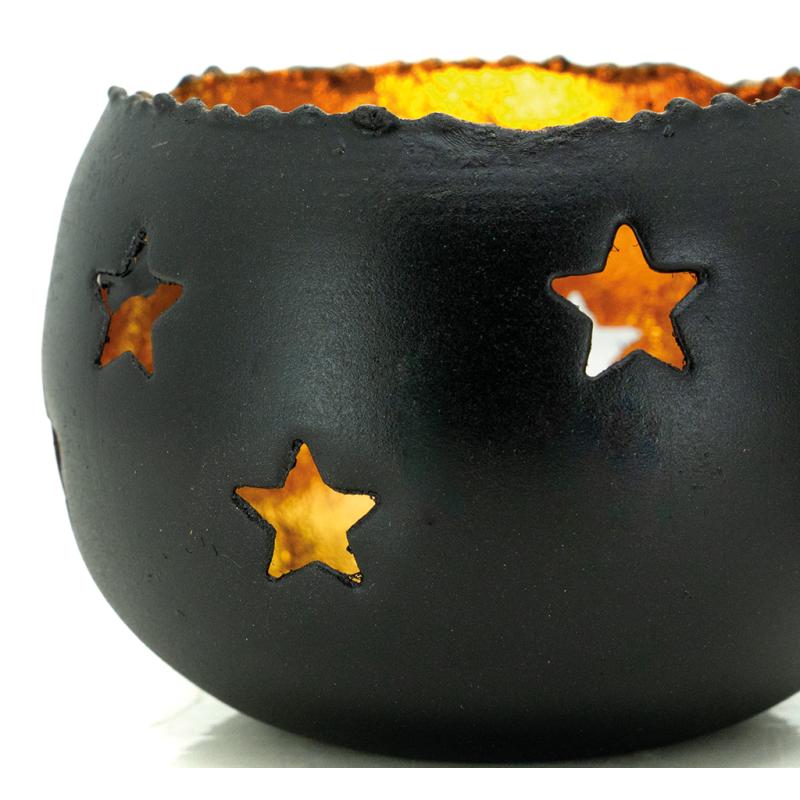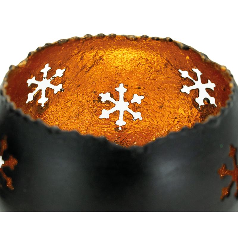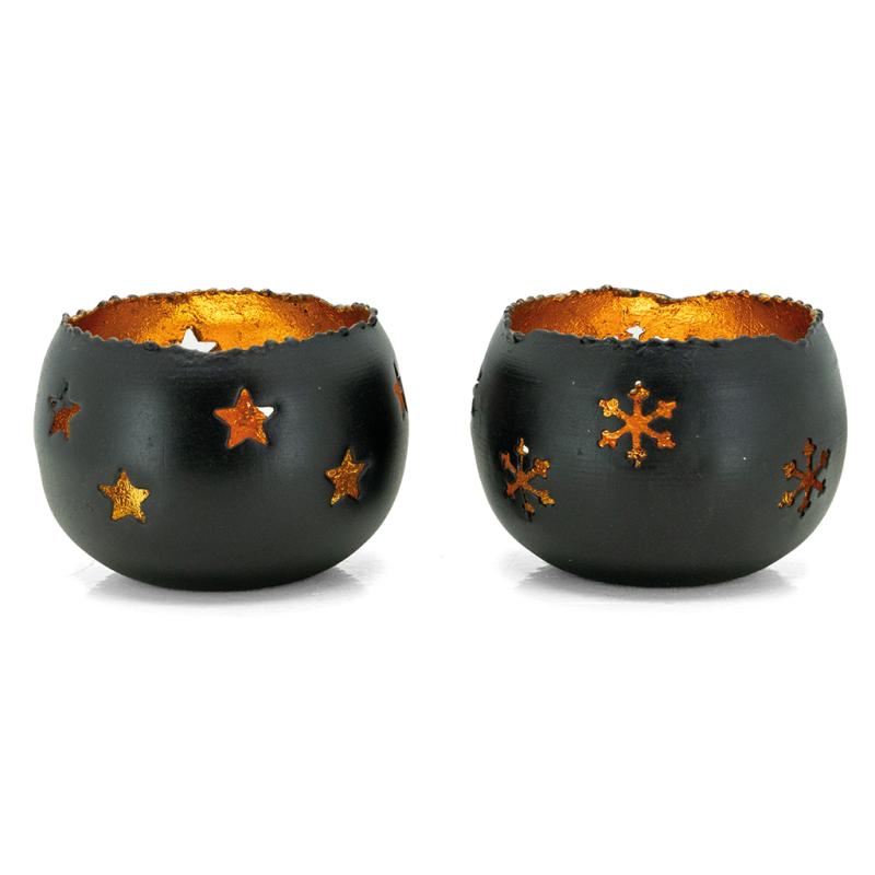 Black lacquered metal candle holders. Two matching designs: snowflake and star. Gold interior.