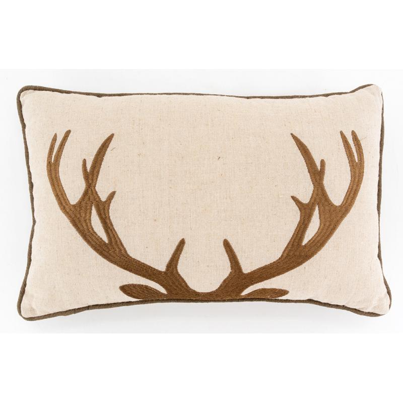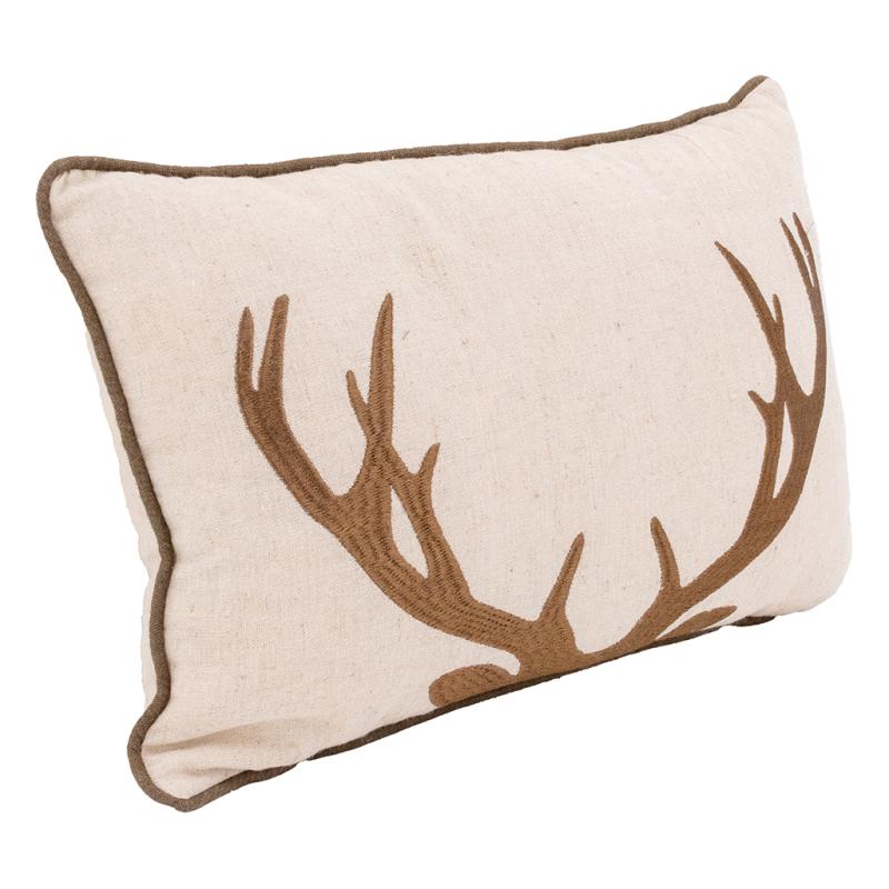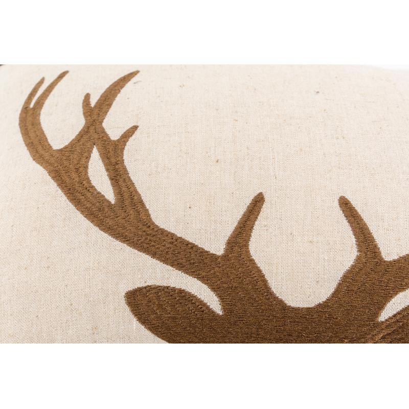 Beige linen and cotton cushion, embroidered with deer and brown edging. Removable cover 30% linen, 25% polyester, 25% cotton, 20% viscose. Filled with 100% polyester fibre.