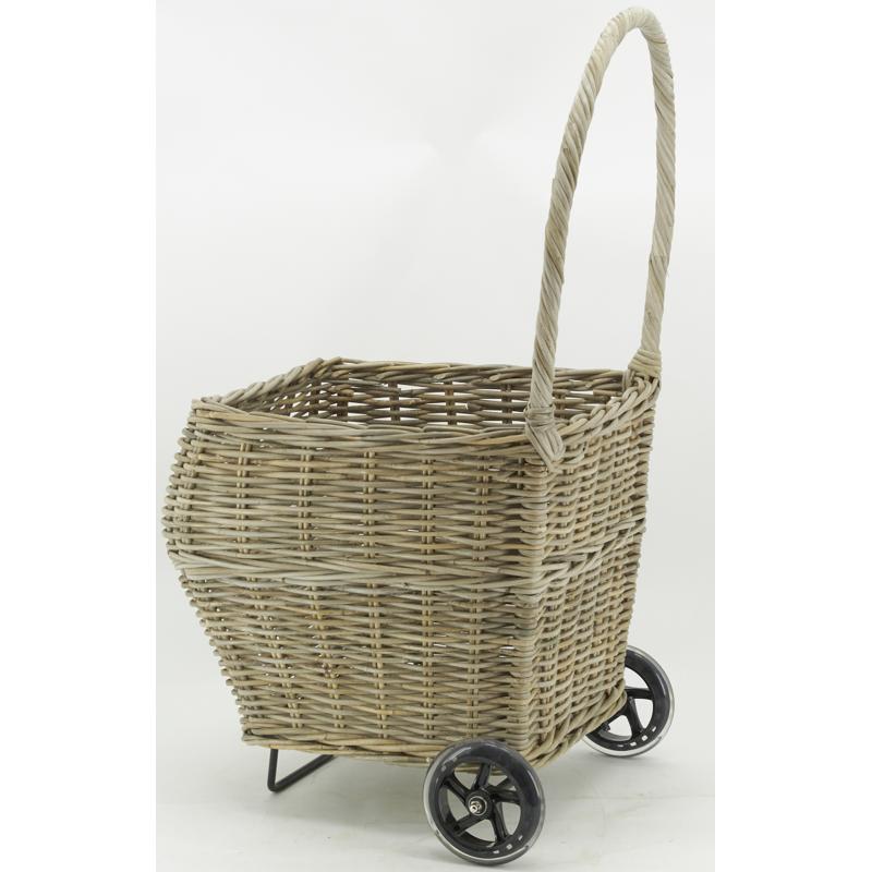 Log basket in grey rattan with 1 handle and 2 wheels. Anti-dust bottom. Non-tearable handle