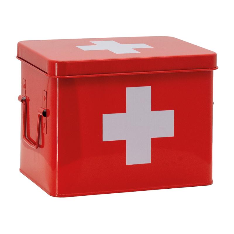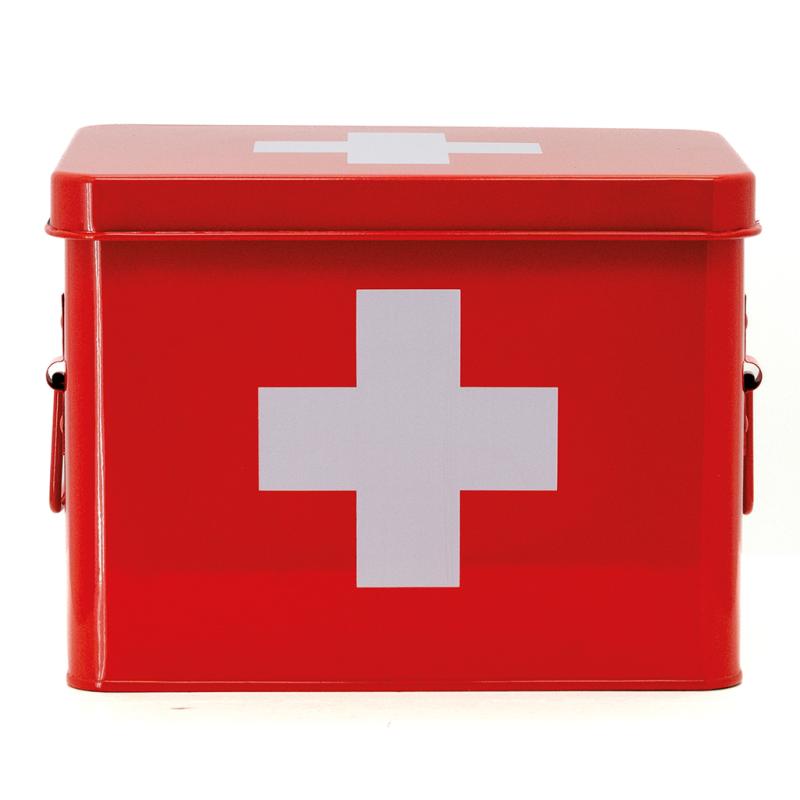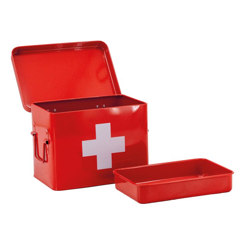 Red metal medicine box with white cross. With storage compartments and handles on the sides.