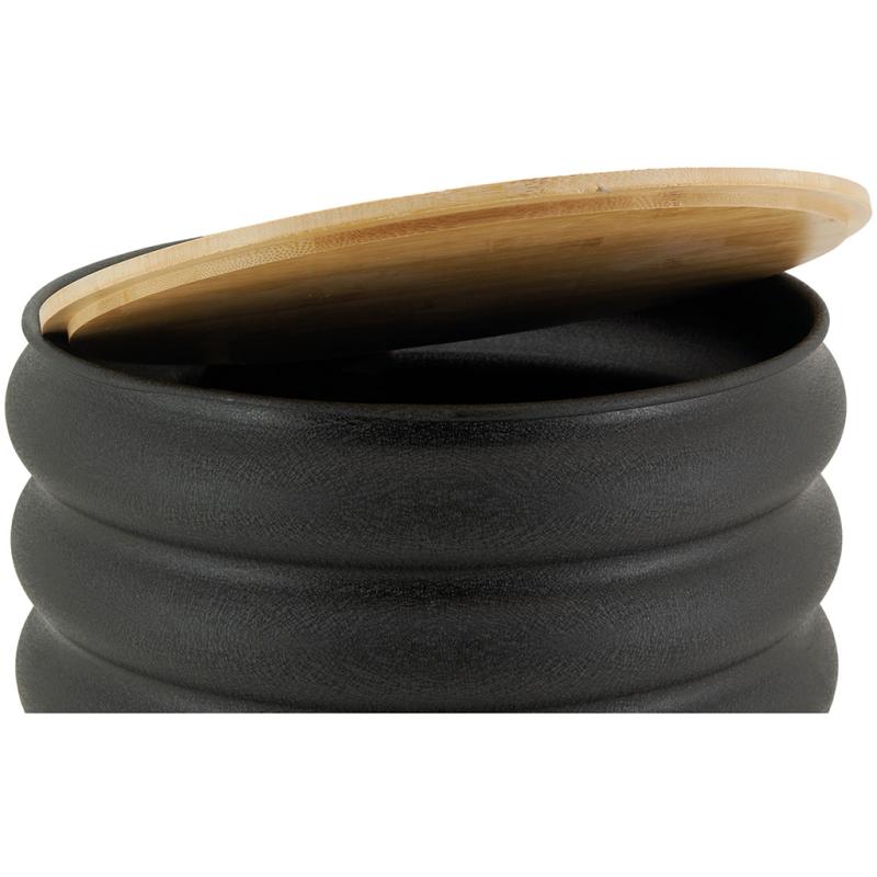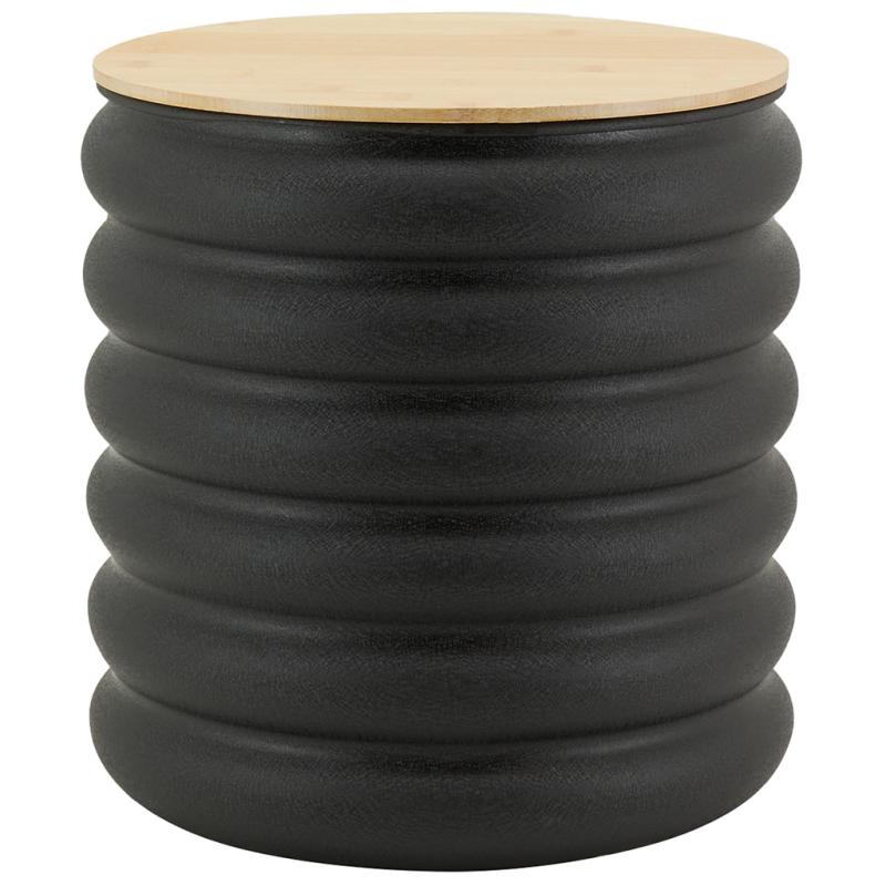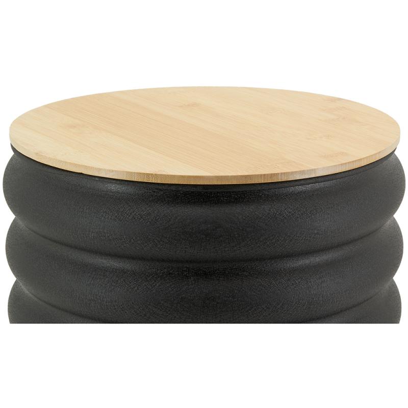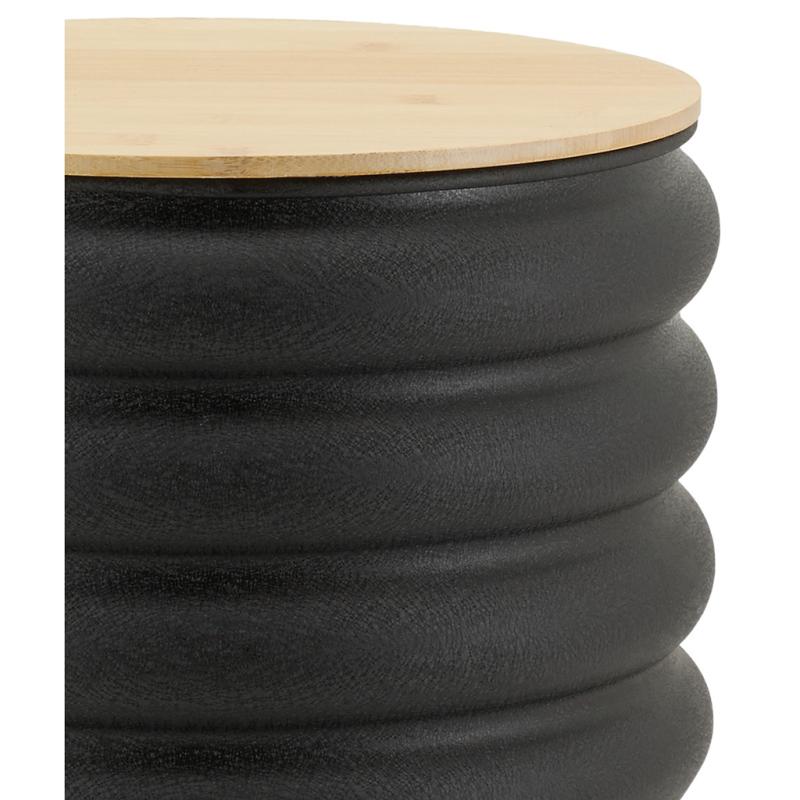 Black matte metal stool/storage bench; lid/seat made of natural bamboo