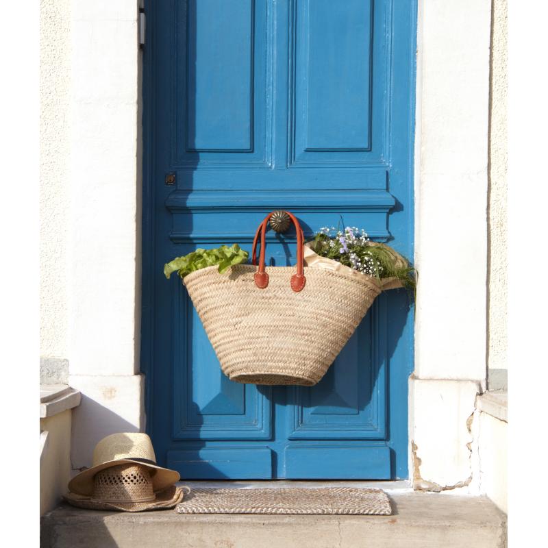 Palm leaf bag with leather shoulder straps. Assorted colors.