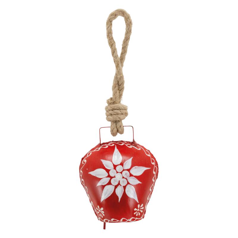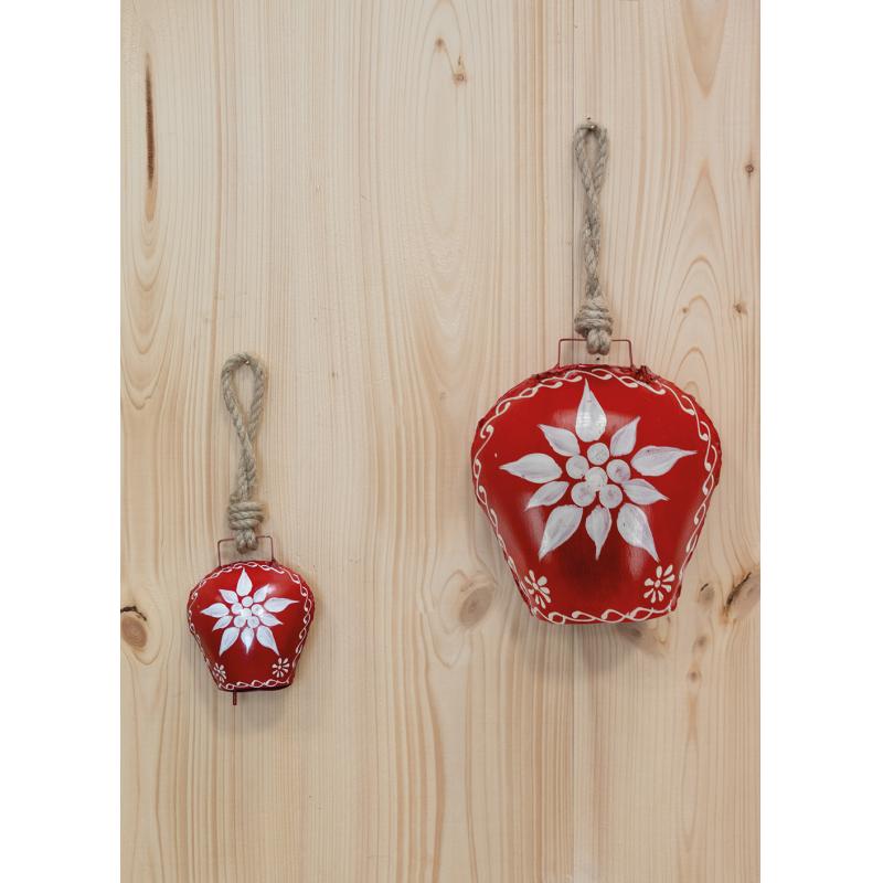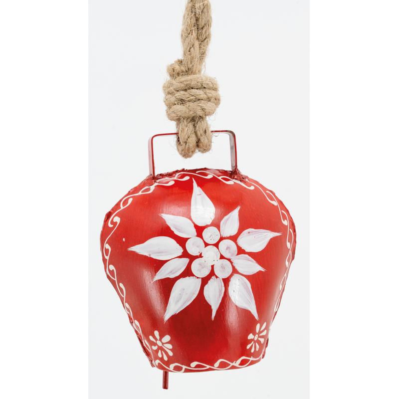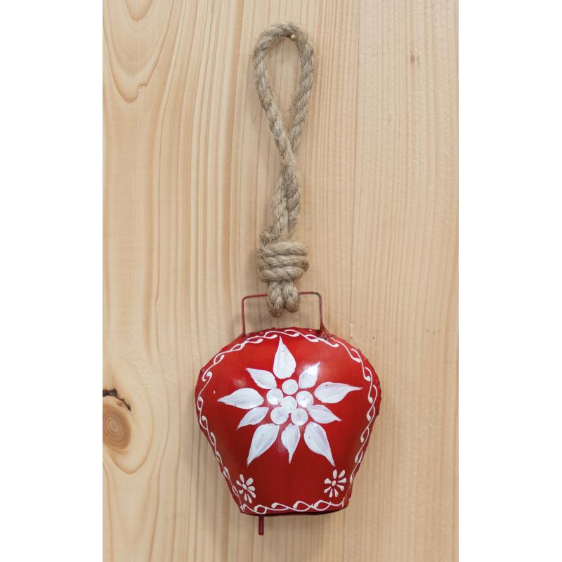 Red-tinted metal bell with white painted edelweiss decoration. Rope handle.