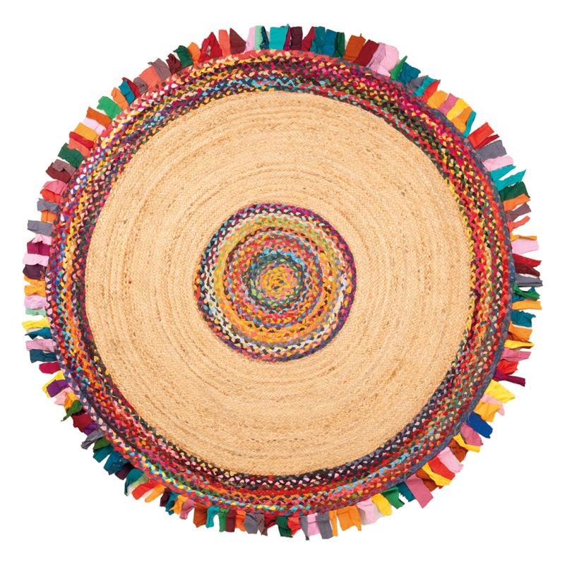 Round rug made of natural jute with colorful fringes made of recycled cotton. Each piece is unique.