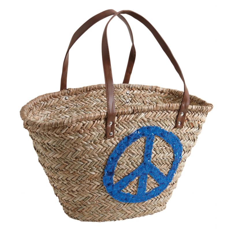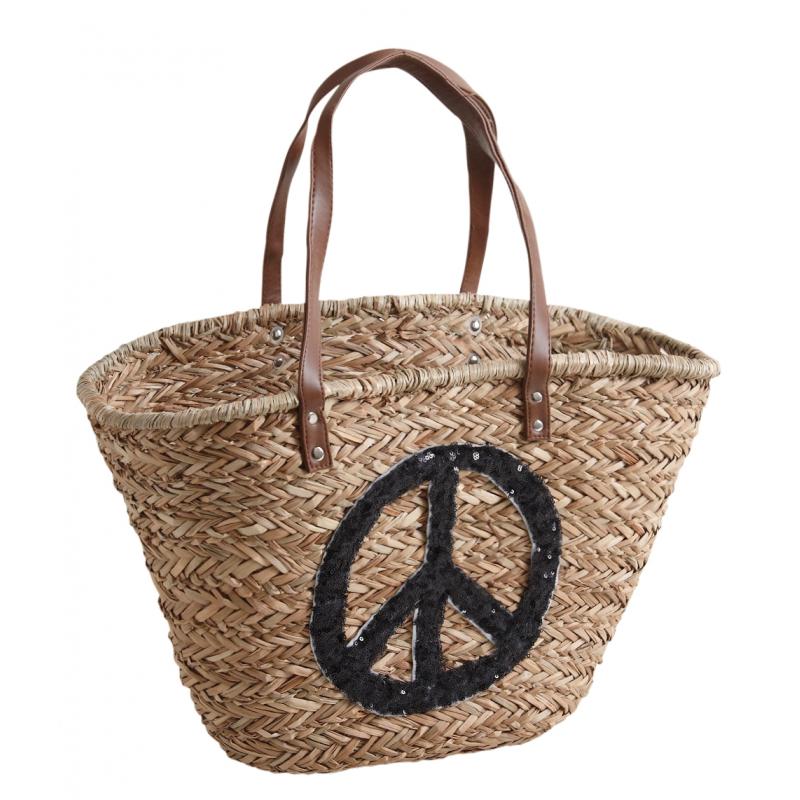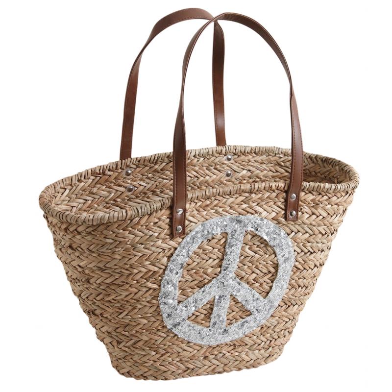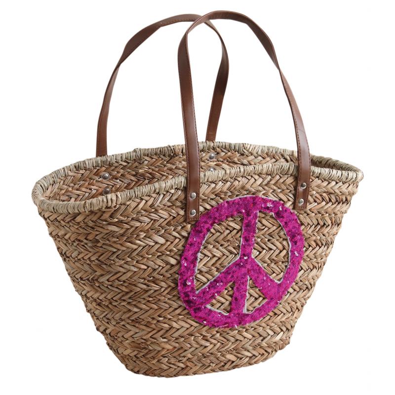 Rush bag with spangled Peace design, simili leather handles. Assorted colors.