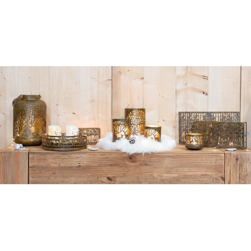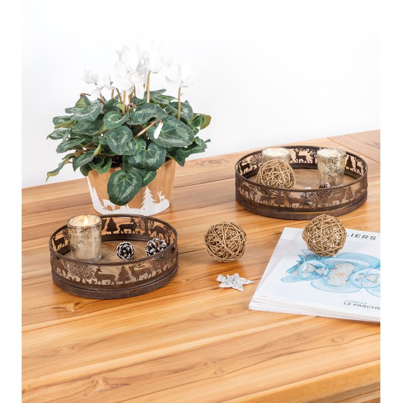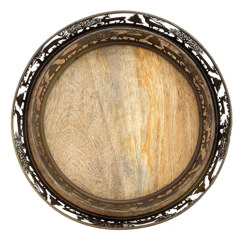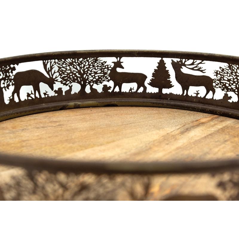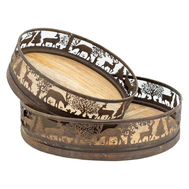 Set of 2 metal trays with deer and pine tree decor and aged-effect mango wood tray