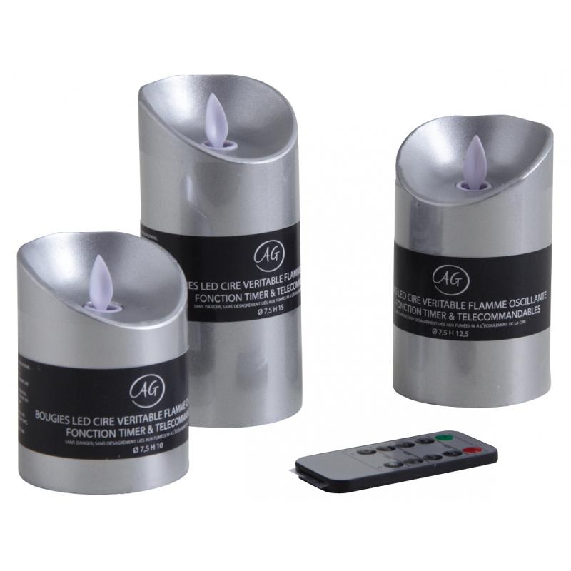 Set of 3 LED candles made of silver-finish real wax, flickering flame with electromagnetic system. Thanks to its LED-backlit flickering flame, this candle strongly imitates the traditional burning candle, without the risk of fire. Powered by 2 AA LR6 batteries (included). Remote control with on/off and timer functions.