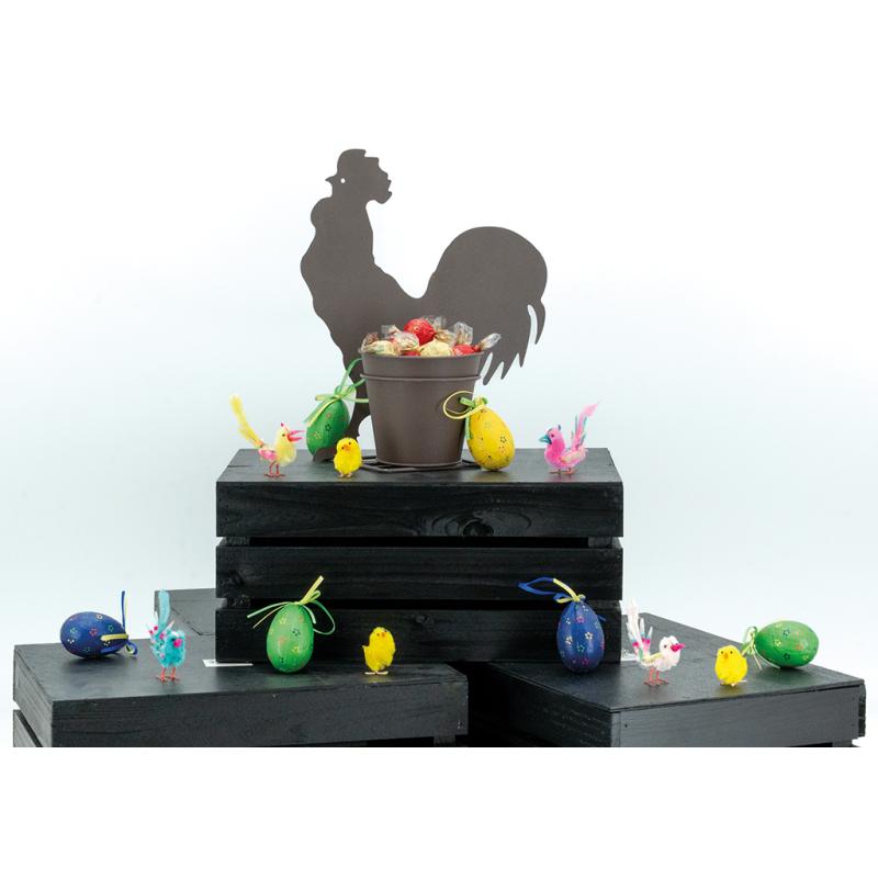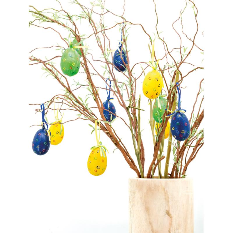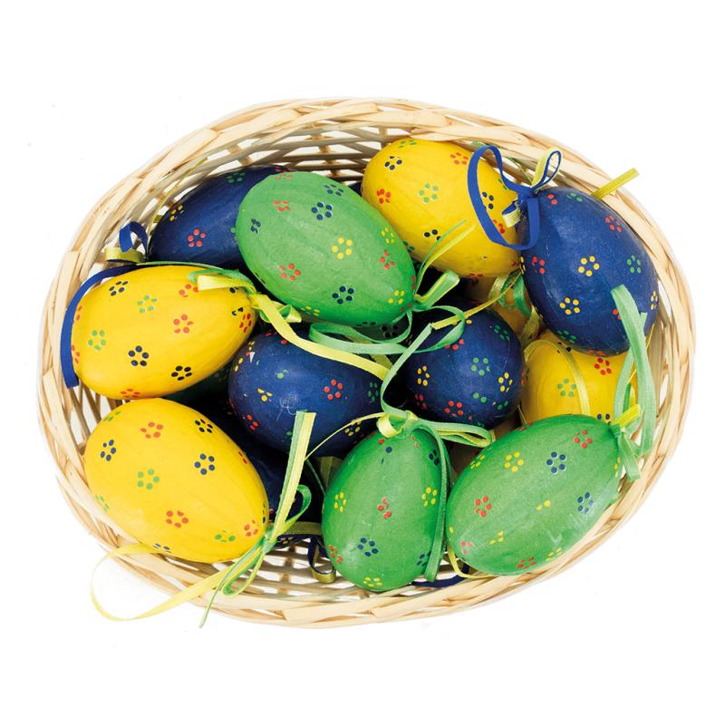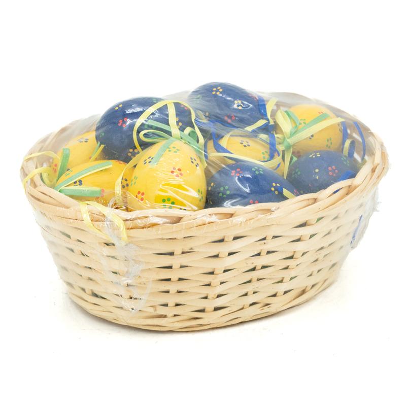 Split willow basket with 18 plastic easter eggs (assorted colors).