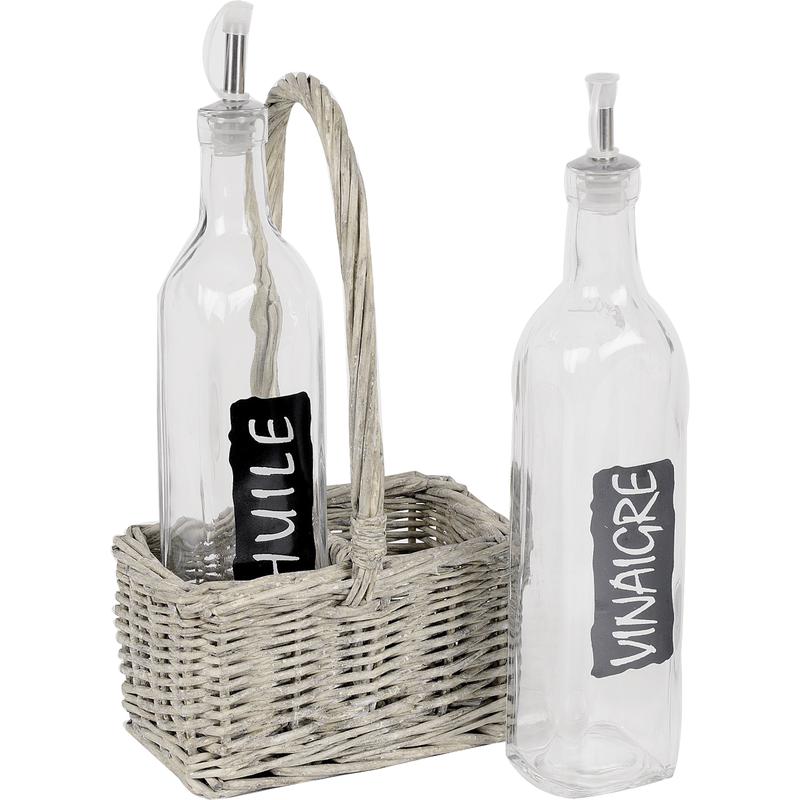 Grey wicker bottle carrier basket + 2 oil and vinegar bottles