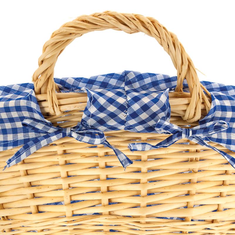White willow clothes basket, blue checkered cotton lining.