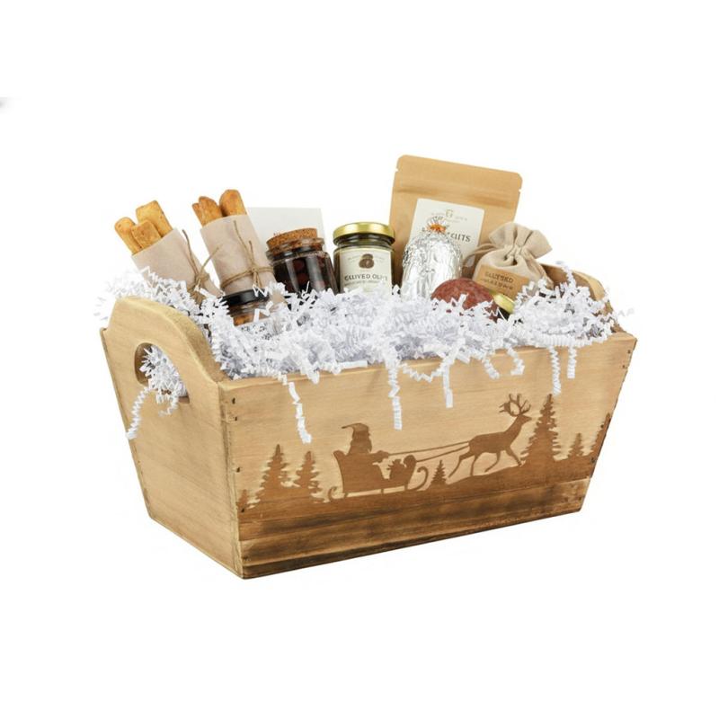 Burned wood basket with christmas pattern and 2 handles.
