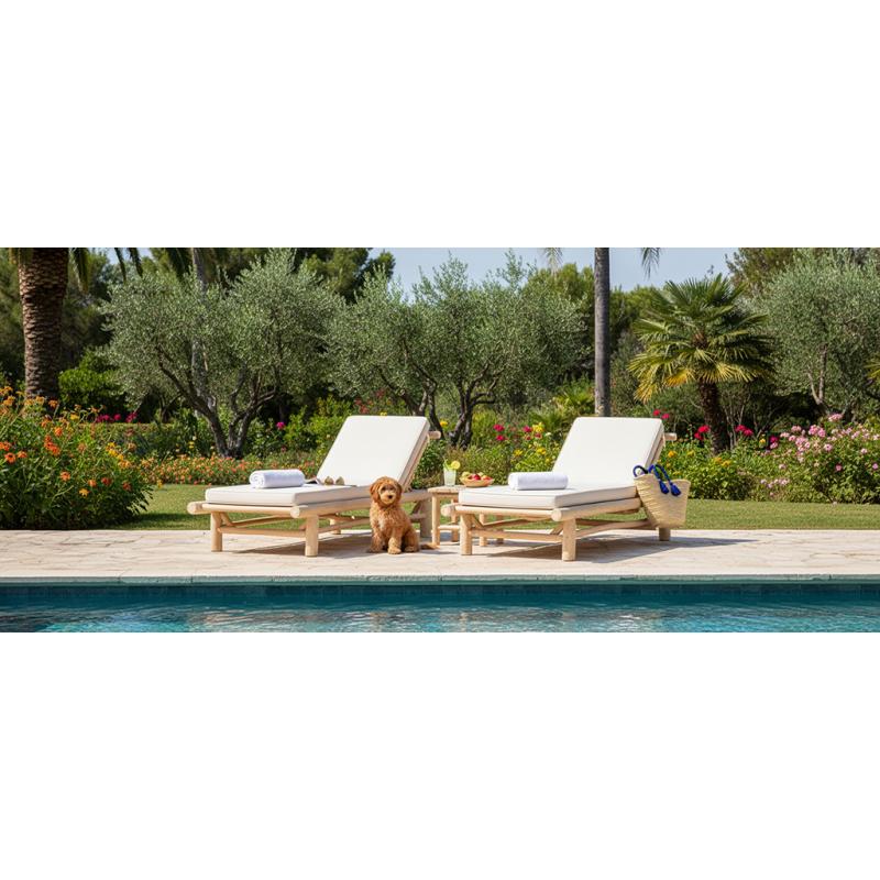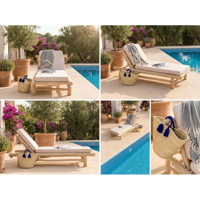 Bain de soleil en teck naturel , nclinable, avec housse de coussin 100% coton, traitée waterproof, déhoussable et lavable