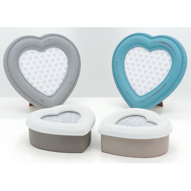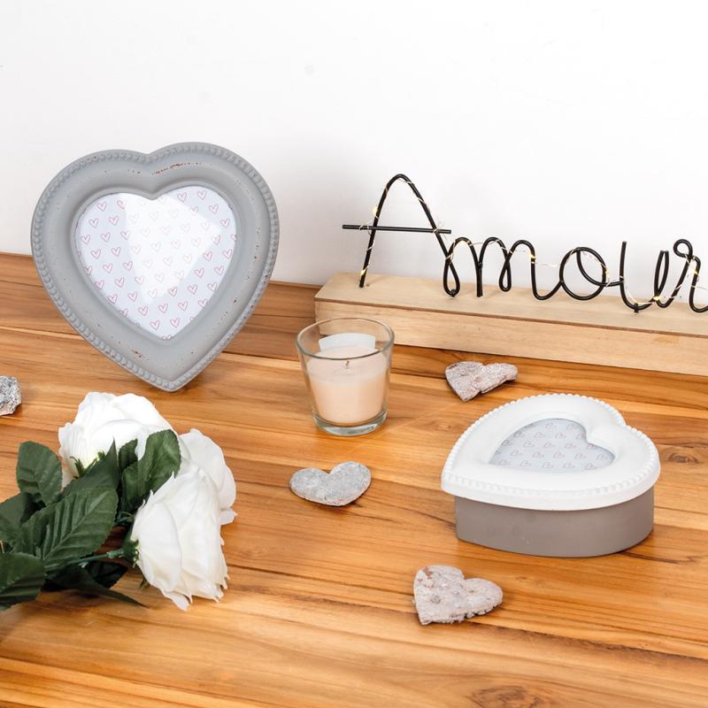 Boite coeur porte-photo en bois laqué et verre. Coloris assortis.