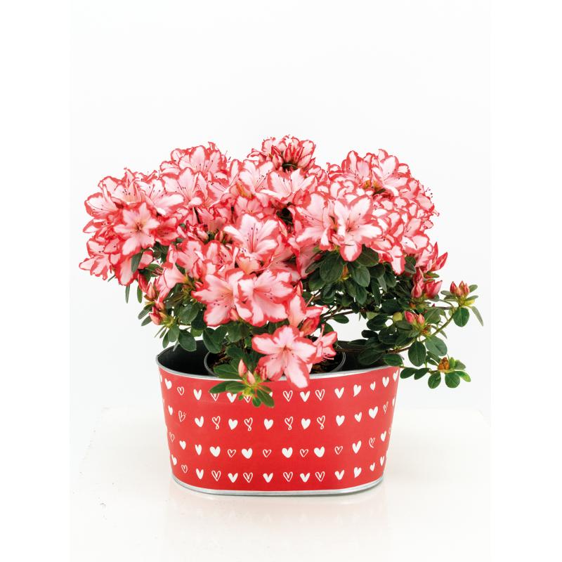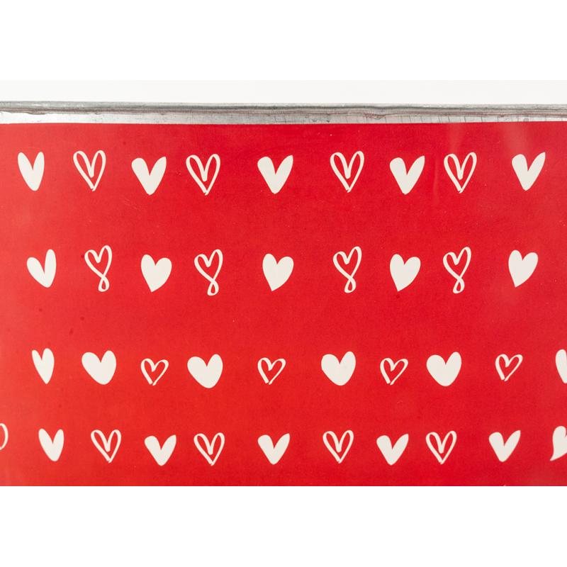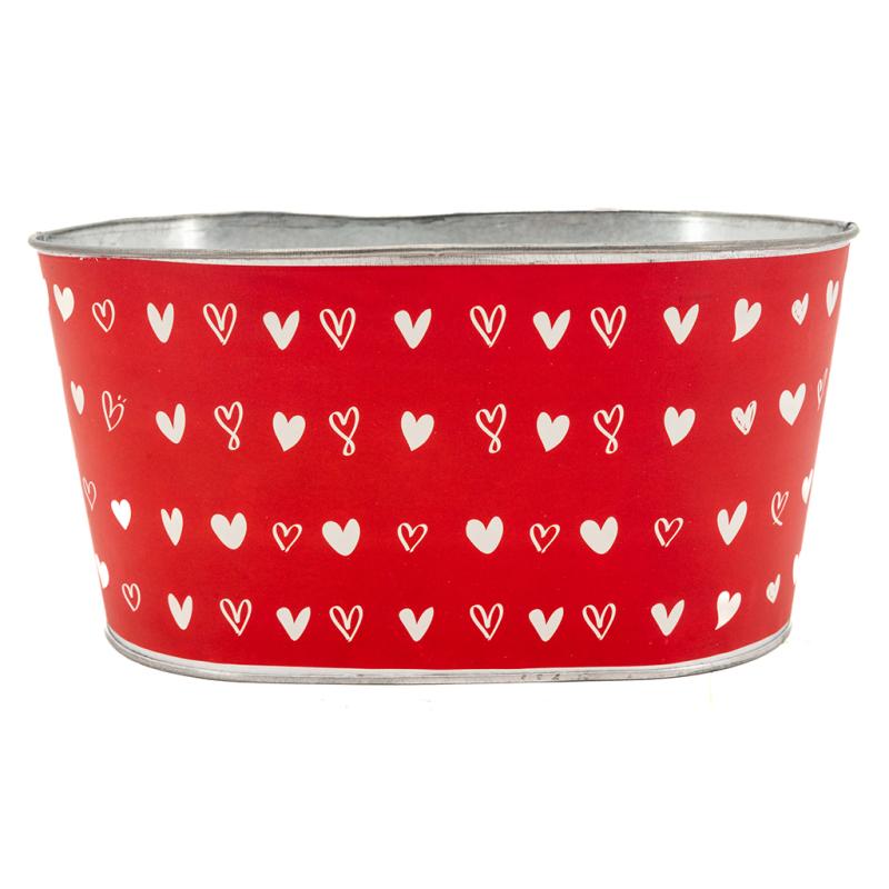 Corbeille ovale en métal décor imprimé coeurs rouges et blancs. Petite taille.