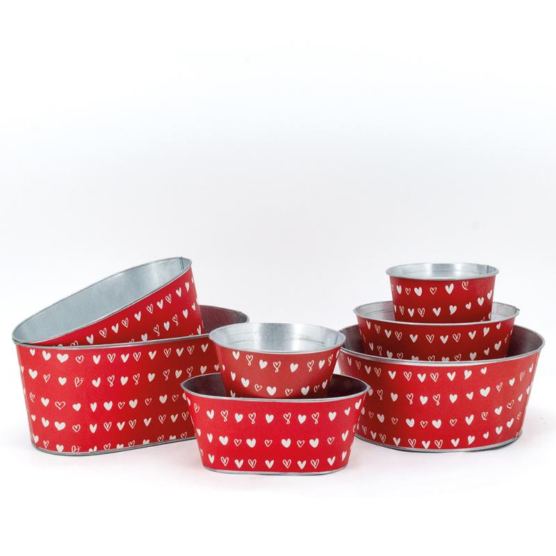 Corbeille ronde en métal décor imprimé coeurs rouges et blanc. Moyenne taille.