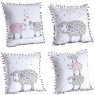 Coussin en coton garni fibre de polyester avec motif mouton et petits coeurs. Des petits pompons habillent le coussin.