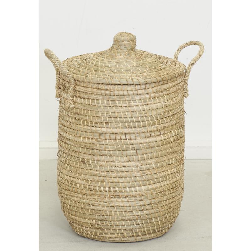 Ensemble de rangement en jonc naturel composé de 5 pièces : 3 paniers à linge avec couvercles, 1 corbeille et 1 plateau.