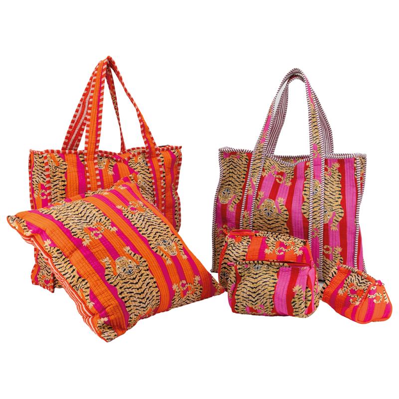 Lot de 3 trousses en coton et nylon orange et rose Motif tigre Avec fermetures éclairs