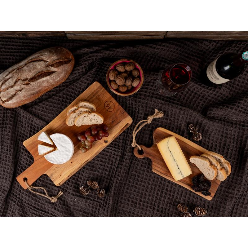 Planche à découper en acacia avec manche et cordelette.