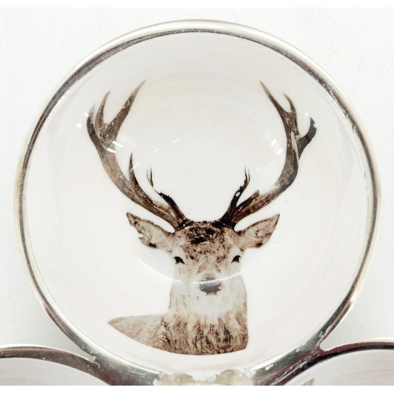 Plat à coupelles en aluminium décor cerf et tête de cerf. Feutrine sous les coupelles.