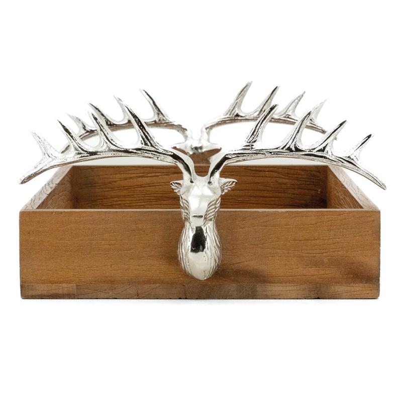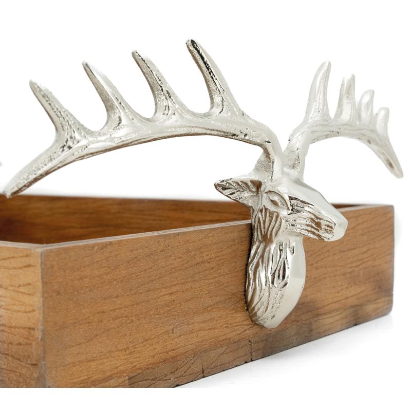 Plateau en bois recylcé avec 2 têtes de cerfs en aluminium .