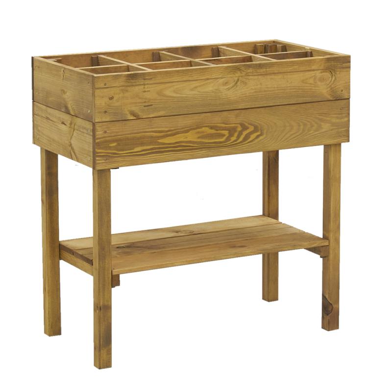 Potager haut en pin avec 8 compartiments (baguettes des compartiments amovibles) et une étagère de rangement. Traitement du bois haute qualité longue durée par bain de teinture qui protège le bois contre les attaques extérieures (pluie, champignons). À monter.