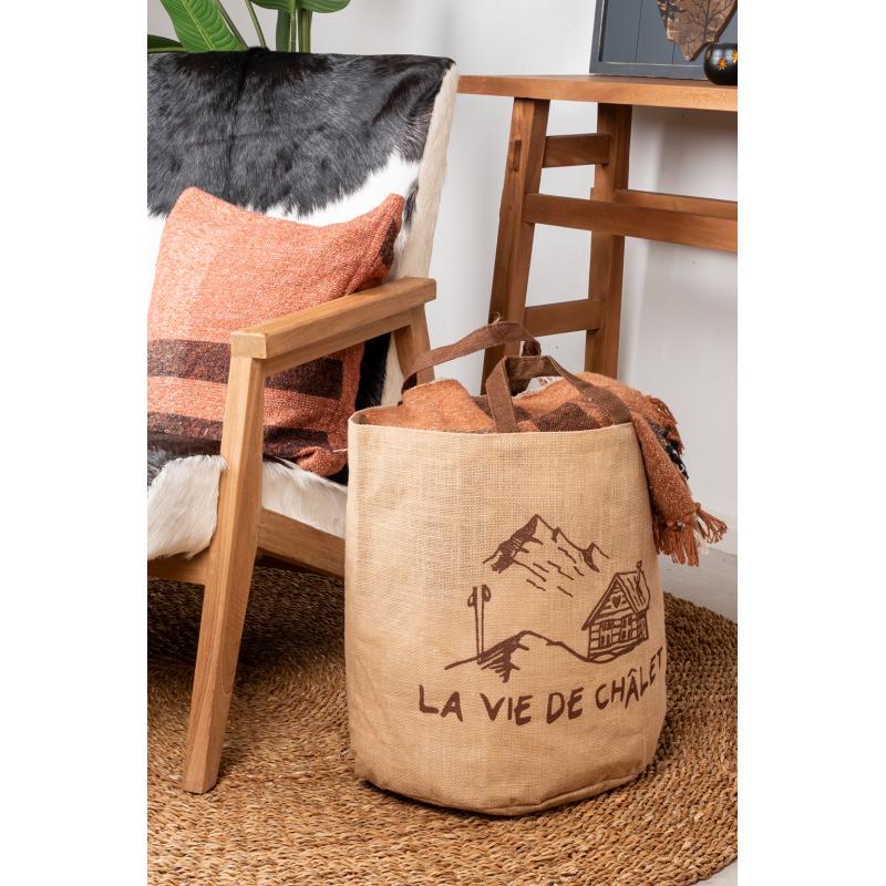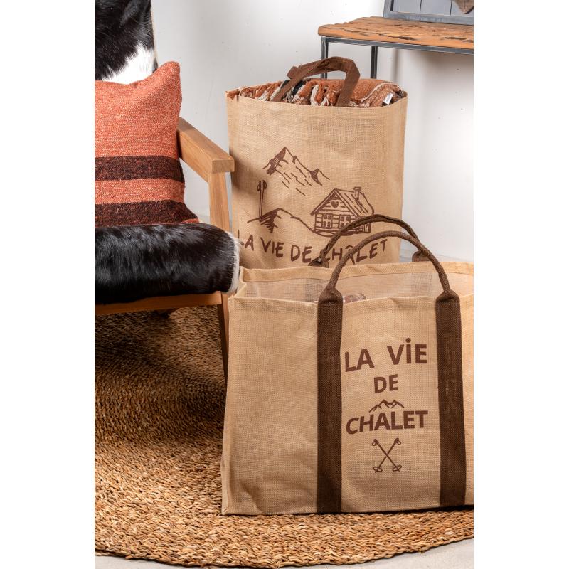 Sac à bûches en jute naturel, décor montagne. Avec anses.