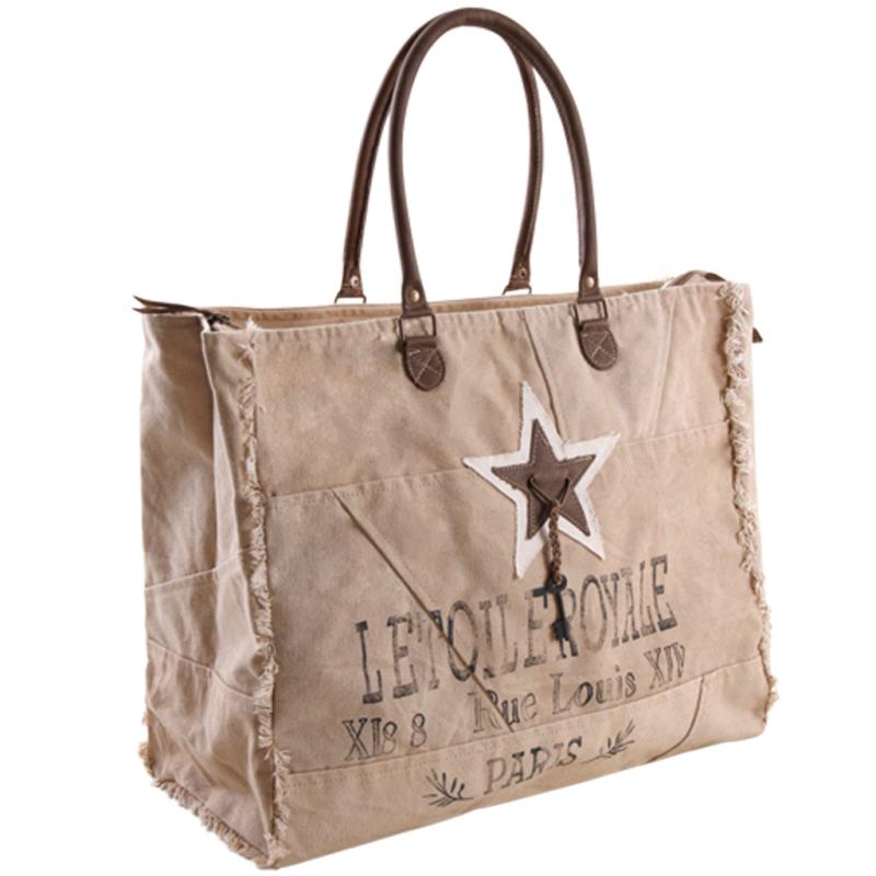 Sac en coton recyclé doublé 100% coton avec anses en cuir couelur beige. Fermeture zippée et poche intérieure zippée.