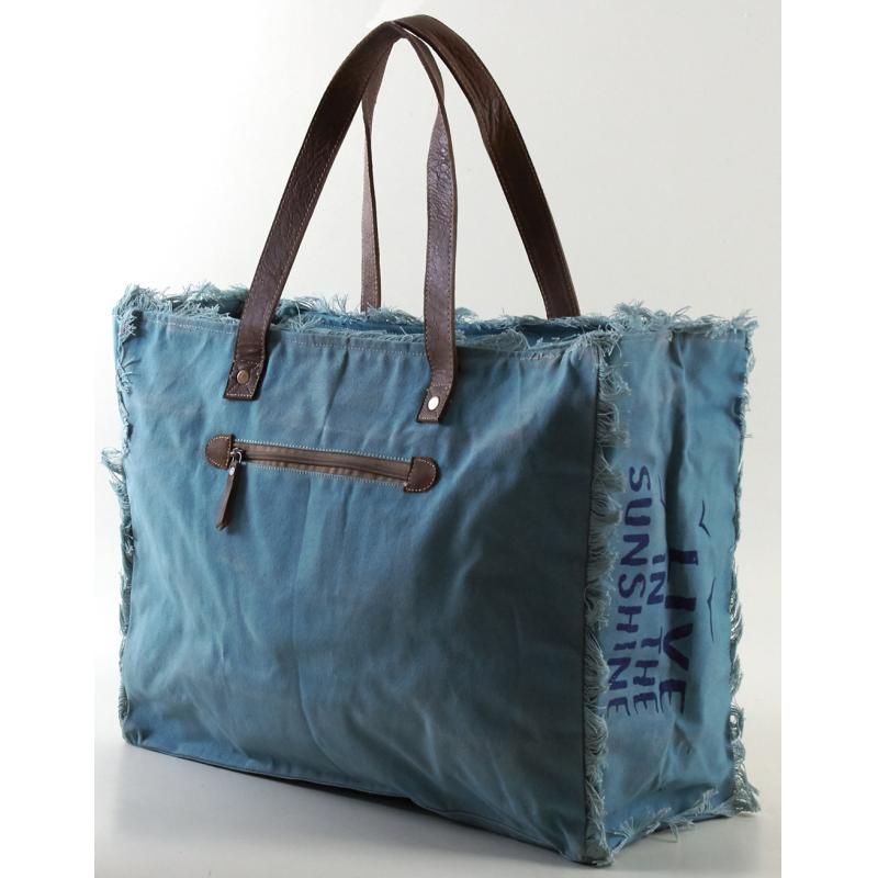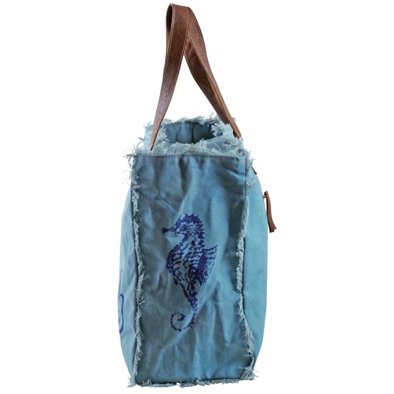 Sac "Life is a beach" en coton avec poignées en cuir, coloris bleu. Fermeture, poches intérieure et extérieure zippées.