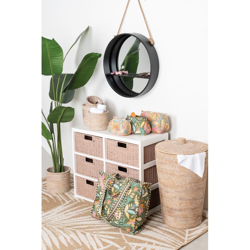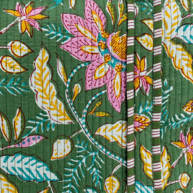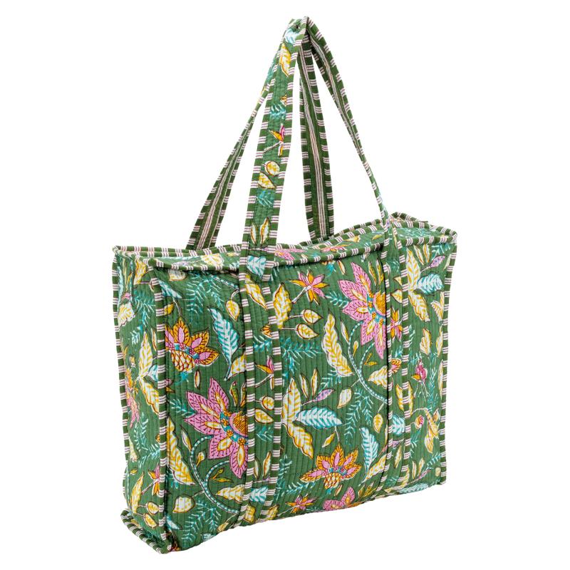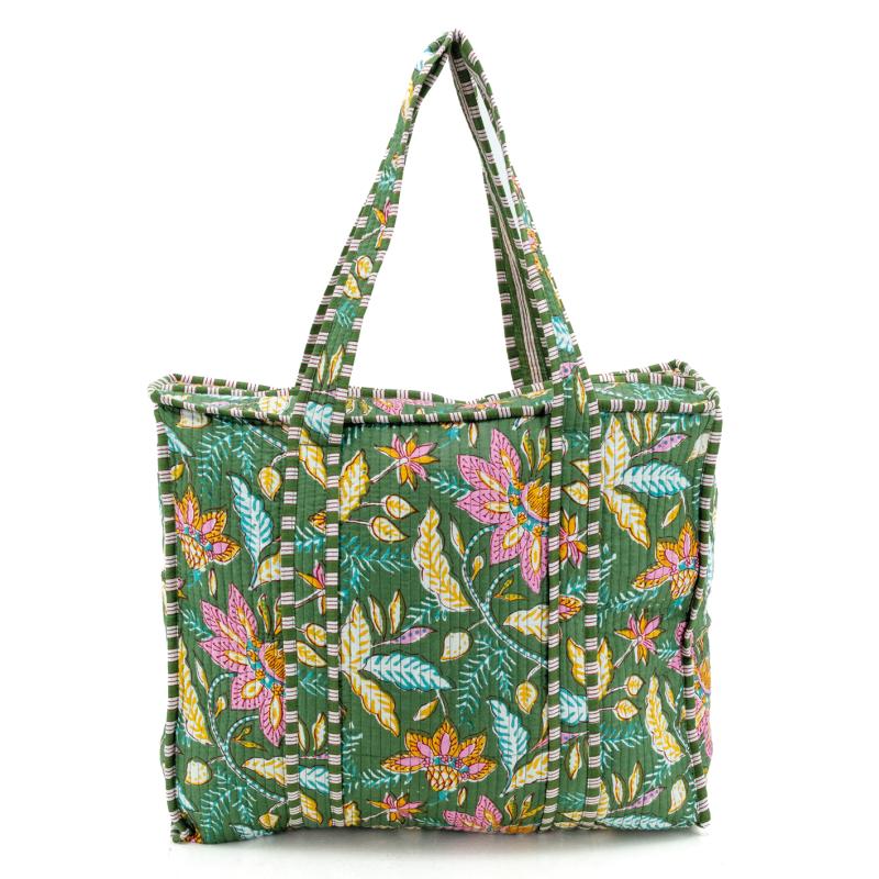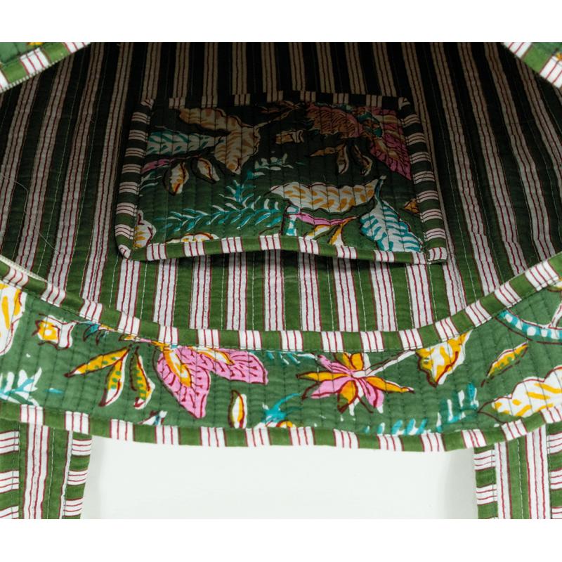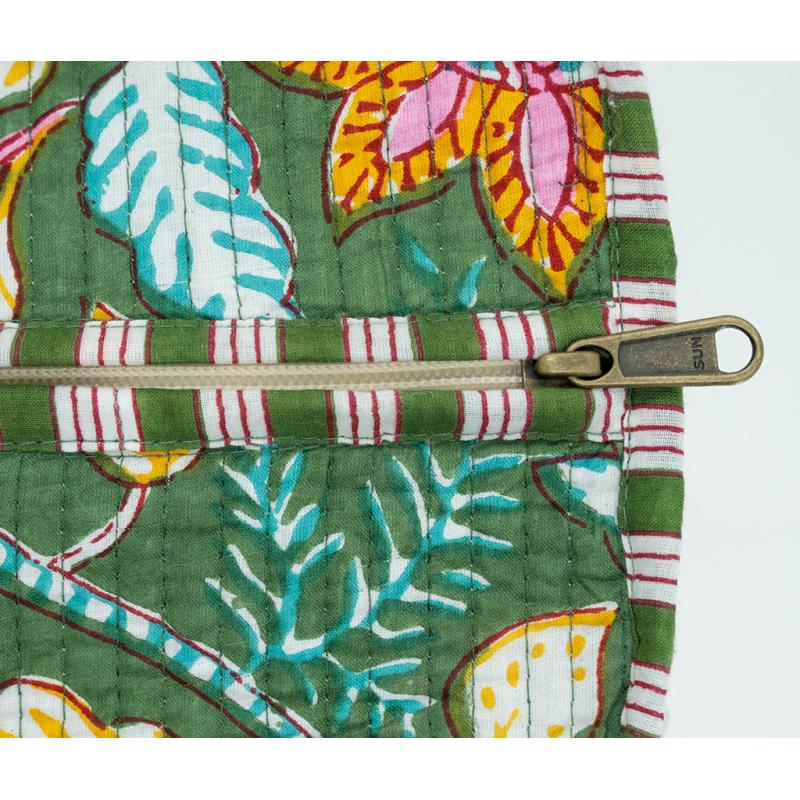 Sac en coton et nylon vert motif fleurs avec fermeture éclair et poche intérieure