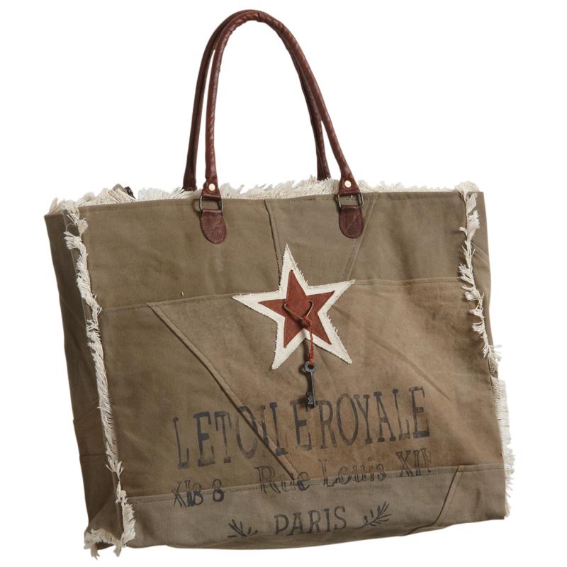 Sac à main en coton recyclé et anses en cuir. Fermeture et poche intérieure zippée.