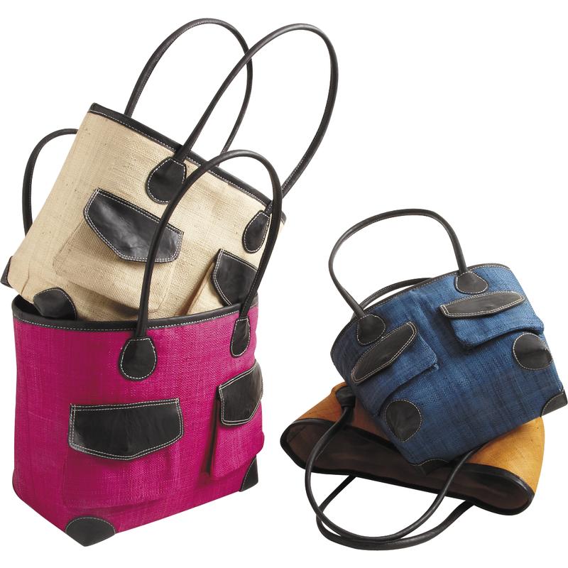 Sacs fantaisie en rabane. Anses et coins en cuir. Fermeture zippée. Poche intérieure zippée + 1 poche téléphone + 2 poches extérieures. Coloris assortis.