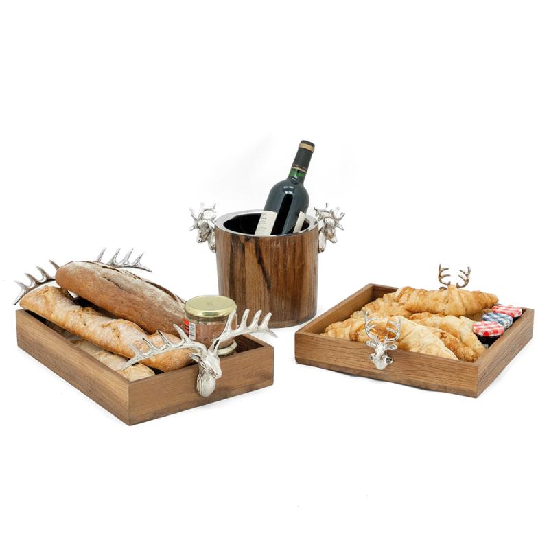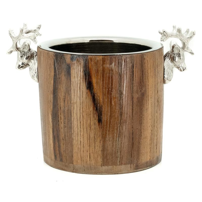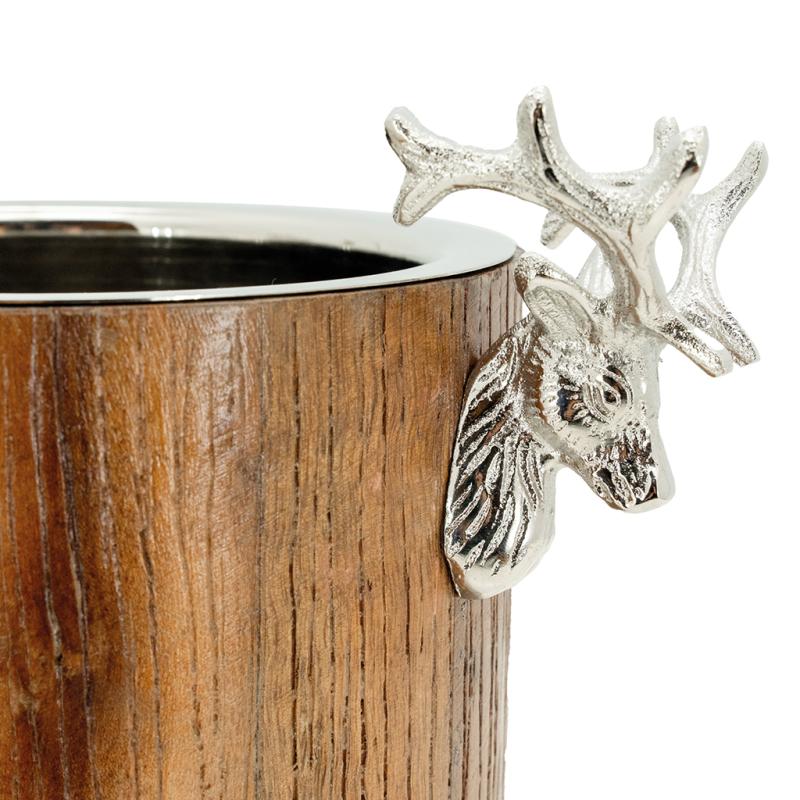 Seau à champagne en bois recyclé avec décor tête de cerf en aluminium. Seau en métal amovible.