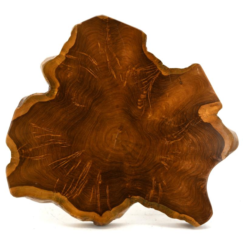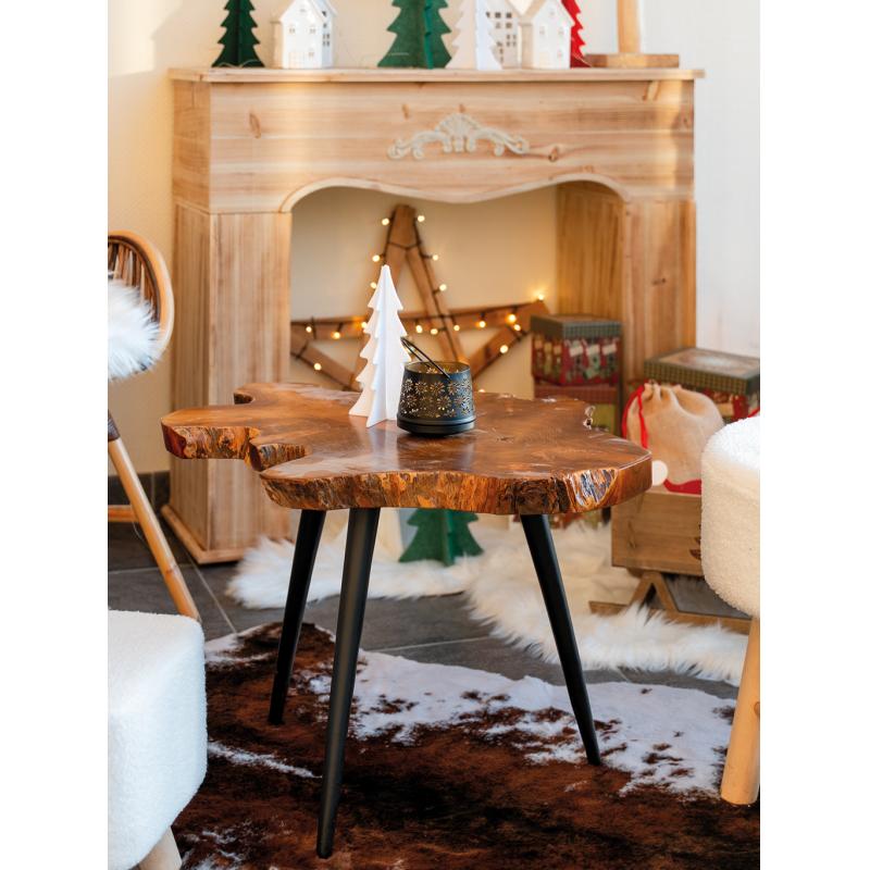 Table d'appoint en teck naturel avec pied en métal.